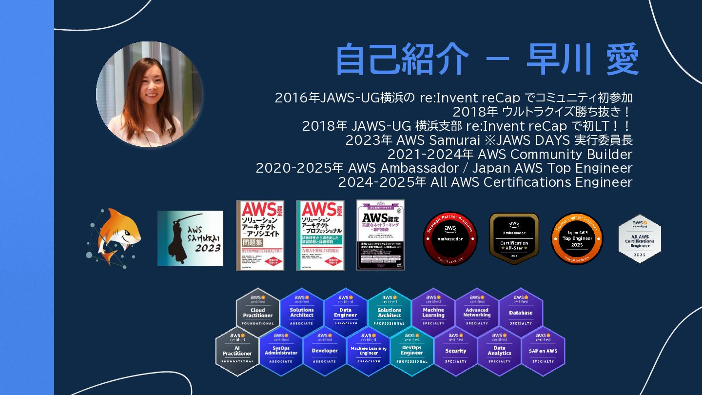 2018年 JAWS-UG 横浜支部 re:Invent reCap で初LT!! 2023年 AWS Samurai ※JAWS DAYS 実行委員長 2021-2024年 AWS Community Builder 2020-2025年 AWS Ambassador / Japan AWS Top Engineer 2024-2025年 All AWS Certifications Engineer
