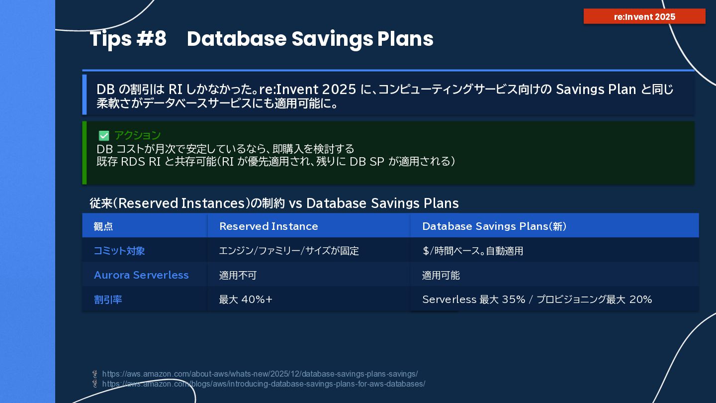 に、コンピューティングサービス向けの Savings Plan と同じ 柔軟さがデータベースサービスにも適用可能に。 アクション DB コストが月次で安定しているなら、即購入を検討する 既存 RDS RI と共存可能(RI が優先適用され、残りに DB SP が適用される) https://aws.amazon.com/about-aws/whats-new/2025/12/database-savings-plans-savings/ https://aws.amazon.com/blogs/aws/introducing-database-savings-plans-for-aws-databases/ 従来(Reserved Instances)の制約 vs Database Savings Plans 観点 Reserved Instance Database Savings Plans(新) コミット対象 エンジン/ファミリー/サイズが固定 $/時間ベース。自動適用 Aurora Serverless 適用不可 適用可能 割引率 最大 40%+ Serverless 最大 35% / プロビジョニング最大 20% re:Invent 2025