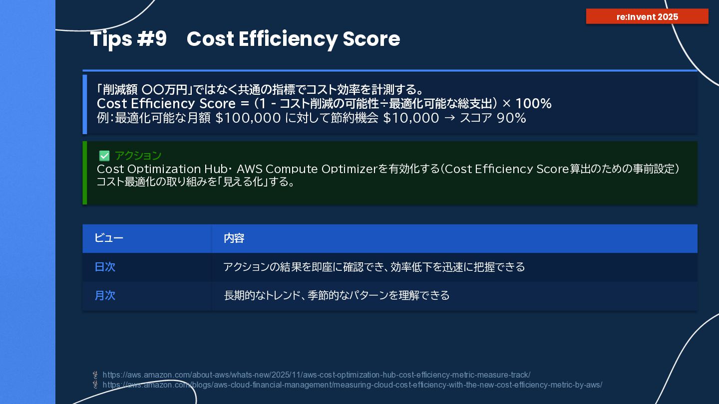 = (1 - コスト削減の可能性÷最適化可能な総支出) × 100% 例:最適化可能な月額 $100,000 に対して節約機会 $10,000 → スコア 90% ビュー 内容 日次 アクションの結果を即座に確認でき、効率低下を迅速に把握できる 月次 長期的なトレンド、季節的なパターンを理解できる https://aws.amazon.com/about-aws/whats-new/2025/11/aws-cost-optimization-hub-cost-efficiency-metric-measure-track/ https://aws.amazon.com/blogs/aws-cloud-financial-management/measuring-cloud-cost-efficiency-with-the-new-cost-efficiency-metric-by-aws/ re:Invent 2025 アクション Cost Optimization Hub・ AWS Compute Optimizerを有効化する(Cost Efficiency Score算出のための事前設定) コスト最適化の取り組みを「見える化」する。