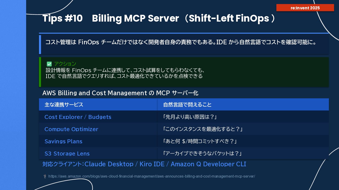 から自然言語でコストを確認可能に。 AWS Billing and Cost Management の MCP サーバー化 主な連携サービス 自然言語で問えること Cost Explorer / Budgets 「先月より高い原因は?」 Compute Optimizer 「このインスタンスを最適化すると?」 Savings Plans 「あと何 $/時間コミットすべき?」 S3 Storage Lens 「アーカイブできそうなバケットは?」 対応クライアント:Claude Desktop / Kiro IDE / Amazon Q Developer CLI https://aws.amazon.com/blogs/aws-cloud-financial-management/aws-announces-billing-and-cost-management-mcp-server/ re:Invent 2025 アクション 設計情報を FinOps チームに連携して、コスト試算をしてもらわなくても、 IDE で自然言語でクエリすれば、コスト最適化できているかを点検できる