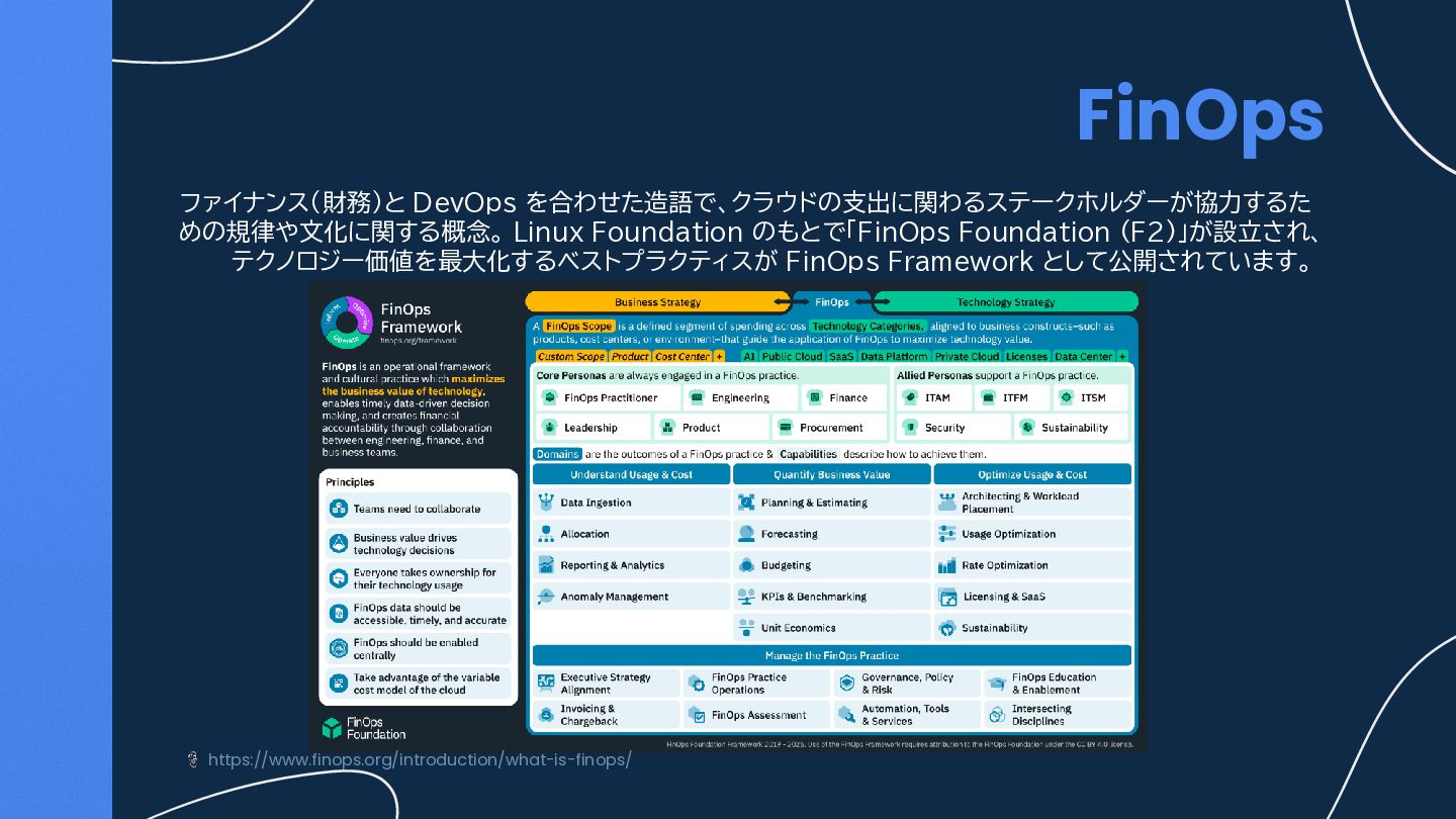 テクノロジー価値を最大化するベストプラクティスが FinOps Framework として公開されています。 https://www.finops.org/introduction/what-is-finops/