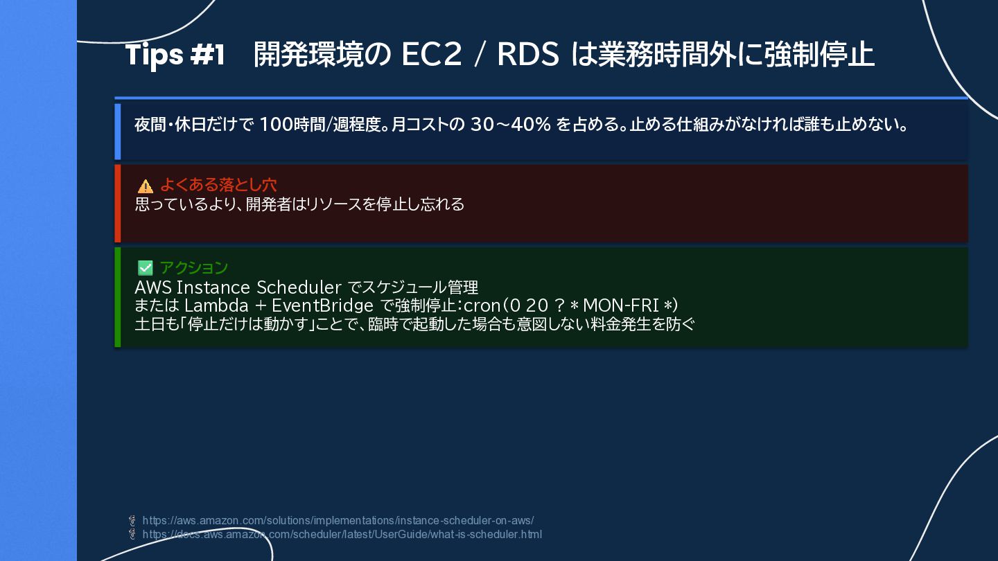 を占める。止める仕組みがなければ誰も止めない。 よくある落とし穴 思っているより、開発者はリソースを停止し忘れる アクション AWS Instance Scheduler でスケジュール管理 または Lambda + EventBridge で強制停止:cron(0 20 ? * MON-FRI *) 土日も「停止だけは動かす」ことで、臨時で起動した場合も意図しない料金発生を防ぐ https://aws.amazon.com/solutions/implementations/instance-scheduler-on-aws/ https://docs.aws.amazon.com/scheduler/latest/UserGuide/what-is-scheduler.html