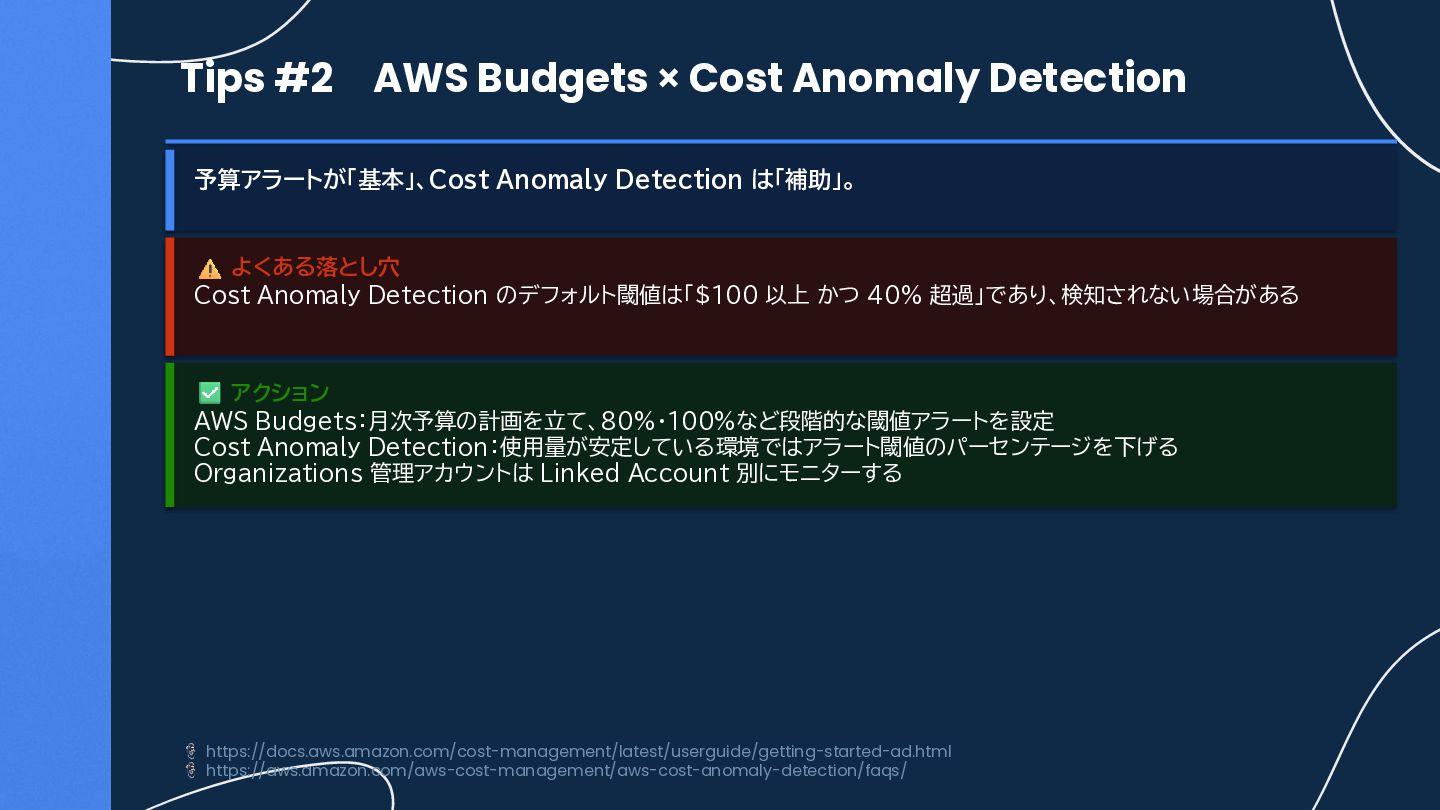 Detection は「補助」。 よくある落とし穴 Cost Anomaly Detection のデフォルト閾値は「$100 以上 かつ 40% 超過」であり、検知されない場合がある アクション AWS Budgets:月次予算の計画を立て、80%・100%など段階的な閾値アラートを設定 Cost Anomaly Detection:使用量が安定している環境ではアラート閾値のパーセンテージを下げる Organizations 管理アカウントは Linked Account 別にモニターする https://docs.aws.amazon.com/cost-management/latest/userguide/getting-started-ad.html https://aws.amazon.com/aws-cost-management/aws-cost-anomaly-detection/faqs/