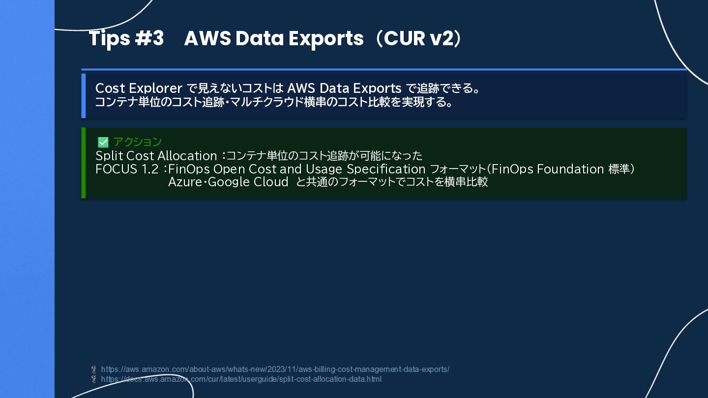 Data Exports で追跡できる。 コンテナ単位のコスト追跡・マルチクラウド横串のコスト比較を実現する。 https://aws.amazon.com/about-aws/whats-new/2023/11/aws-billing-cost-management-data-exports/ https://docs.aws.amazon.com/cur/latest/userguide/split-cost-allocation-data.html アクション Split Cost Allocation :コンテナ単位のコスト追跡が可能になった FOCUS 1.2 :FinOps Open Cost and Usage Specification フォーマット(FinOps Foundation 標準) Azure・Google Cloud と共通のフォーマットでコストを横串比較