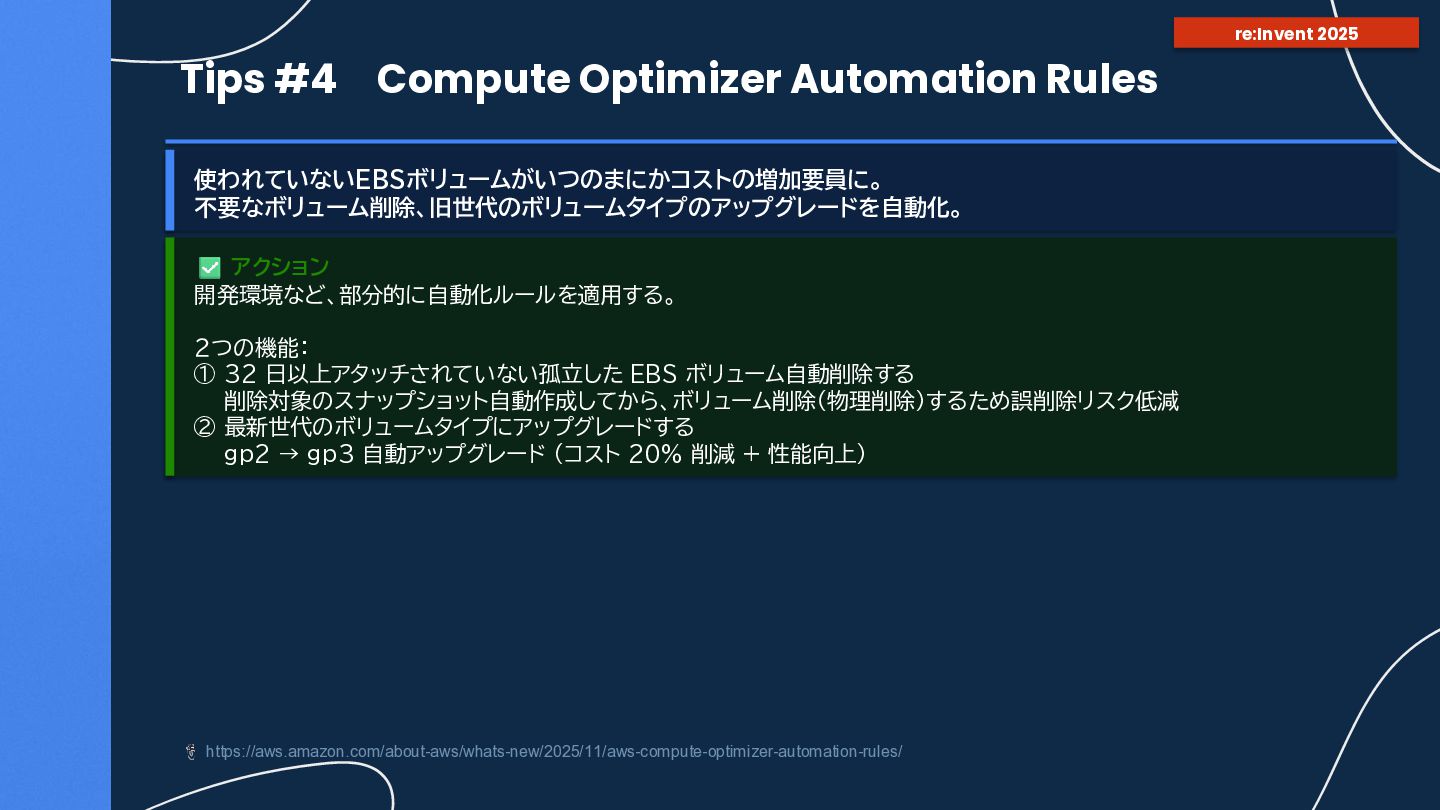 6. Tips #4 Compute Optimizer Automation Rules 使われていないEBSボリュームがいつのまにかコストの増加要員に。 不要なボリューム削除、旧世代のボリュームタイプのアップグレードを自動化。 https://aws.amazon.com/about-aws/whats-new/2025/11/aws-compute-optimizer-automation-rules/ アクション