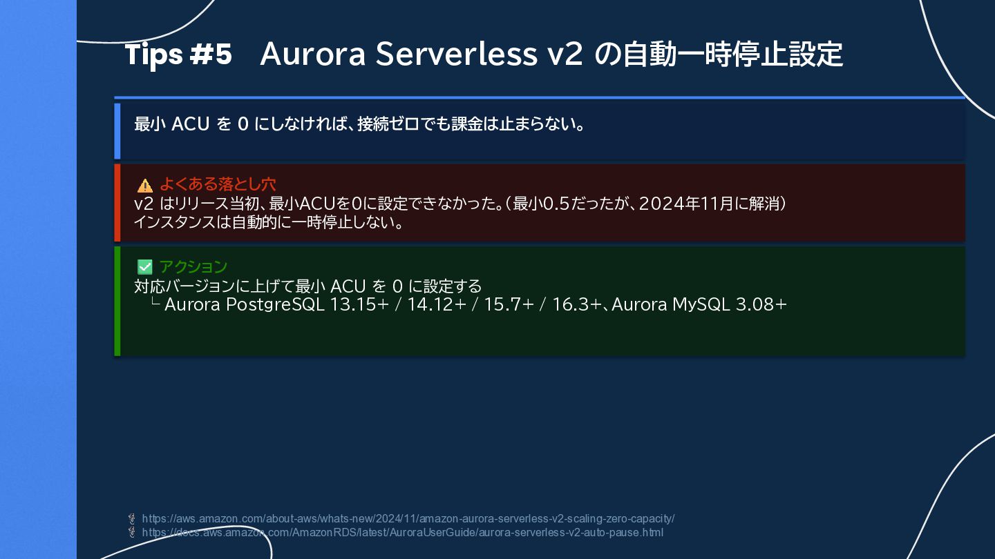 にしなければ、接続ゼロでも課金は止まらない。 よくある落とし穴 v2 はリリース当初、最小ACUを0に設定できなかった。(最小0.5だったが、2024年11月に解消) インスタンスは自動的に一時停止しない。 アクション 対応バージョンに上げて最小 ACU を 0 に設定する └ Aurora PostgreSQL 13.15+ / 14.12+ / 15.7+ / 16.3+、Aurora MySQL 3.08+ https://aws.amazon.com/about-aws/whats-new/2024/11/amazon-aurora-serverless-v2-scaling-zero-capacity/ https://docs.aws.amazon.com/AmazonRDS/latest/AuroraUserGuide/aurora-serverless-v2-auto-pause.html