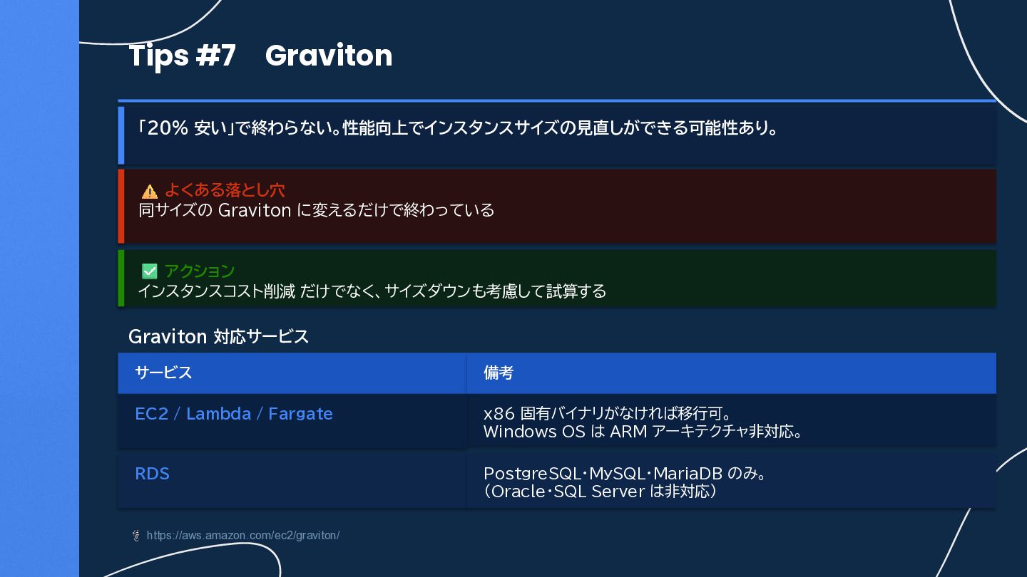 インスタンスコスト削減 だけでなく、サイズダウンも考慮して試算する https://aws.amazon.com/ec2/graviton/ Graviton 対応サービス サービス 備考 RDS PostgreSQL・MySQL・MariaDB のみ。 (Oracle・SQL Server は非対応) x86 固有バイナリがなければ移行可。 Windows OS は ARM アーキテクチャ非対応。 EC2 / Lambda / Fargate