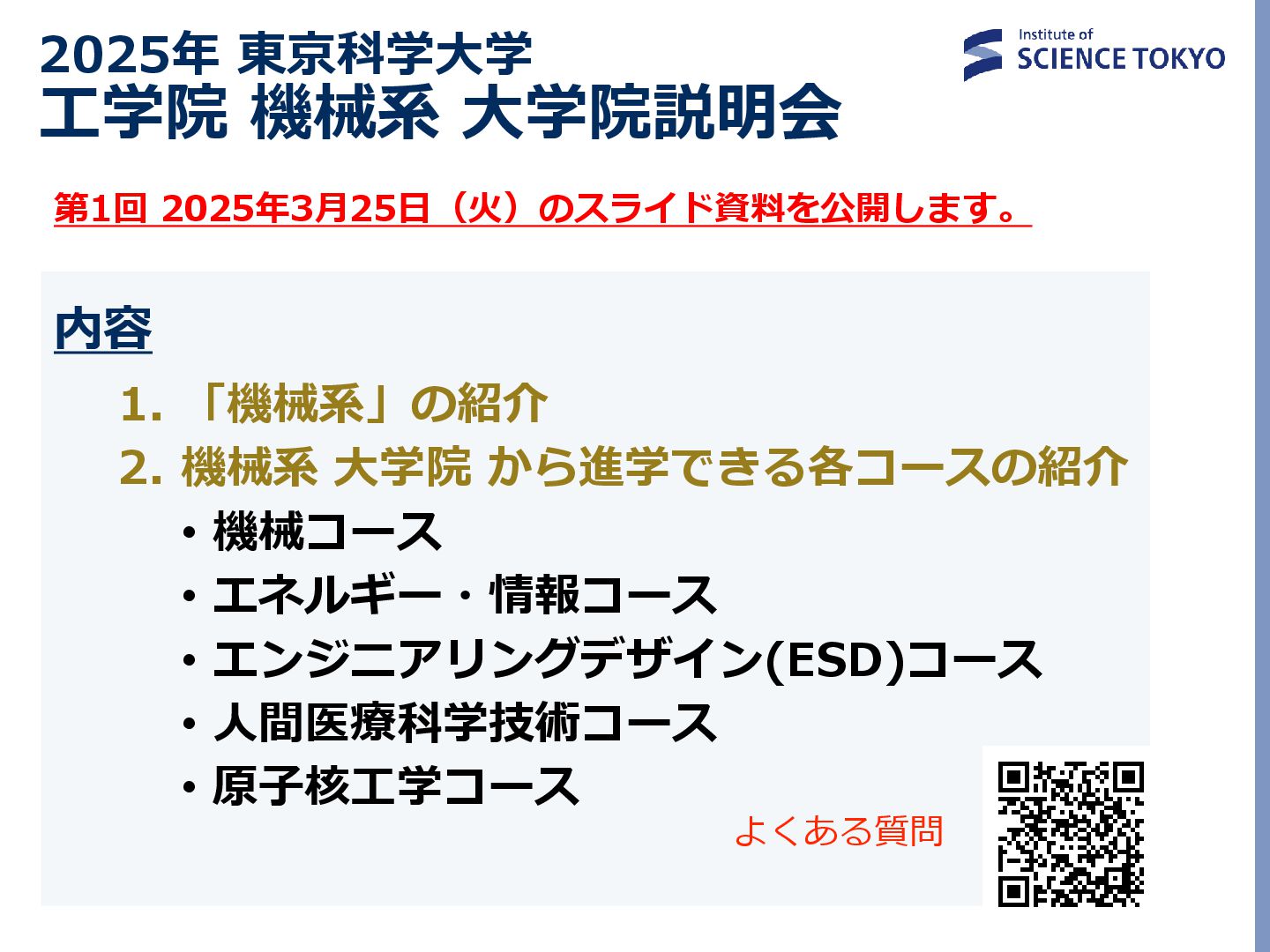 エネルギー・情報コース • エンジニアリングデザイン(ESD)コース • 人間医療科学技術コース • 原子核工学コース 2025年 東京科学大学 工学院 機械系 大学院説明会 よくある質問 第1回 2025年3月25日(火)のスライド資料を公開します。
