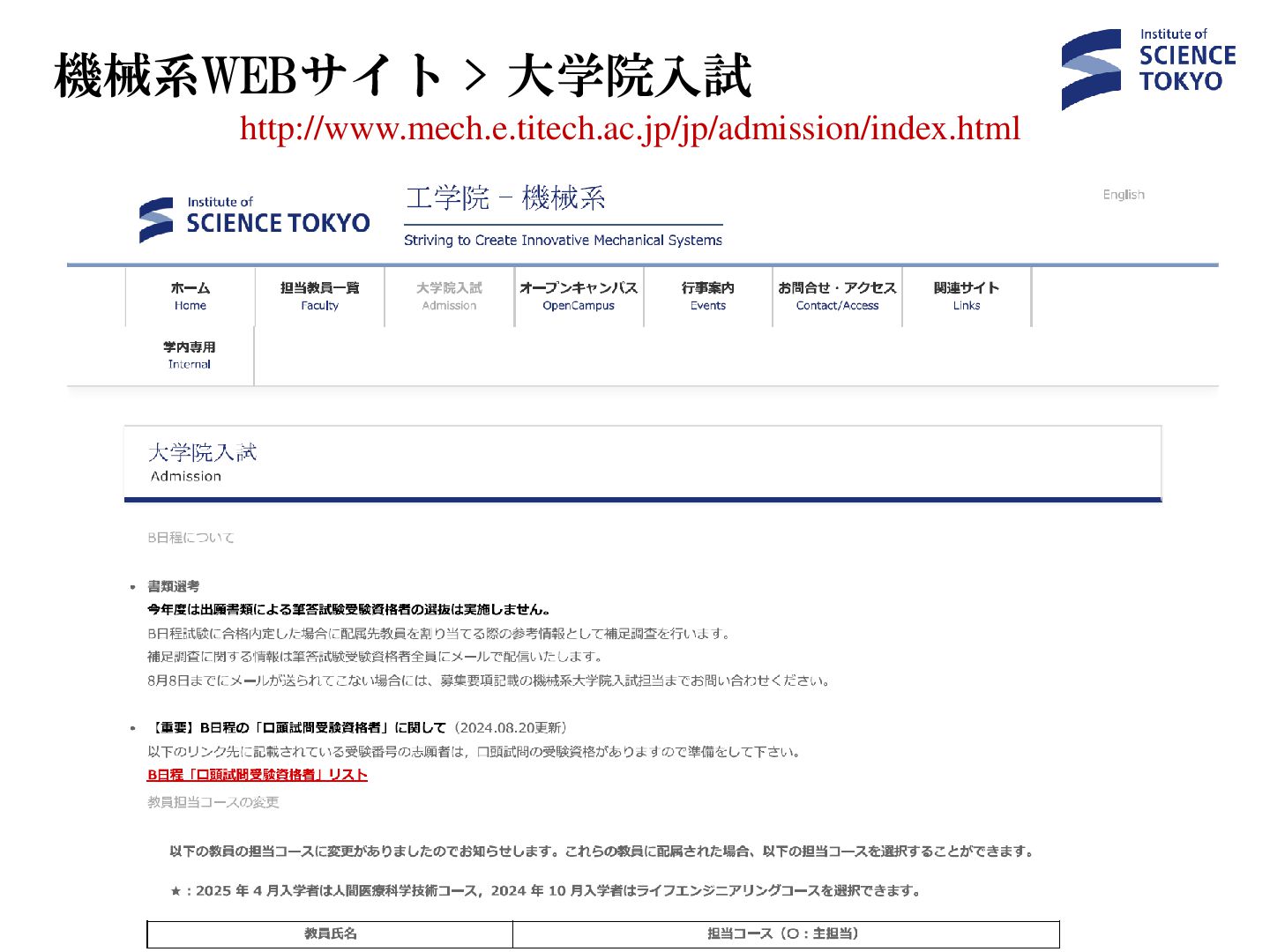 機械系WEBサイト > 担当教員一覧 http://www.mech.e.titech.ac.jp/jp/faculty/index.html 大学院入試において学生を受け入れ可能な教員は募集要項で確認のこと