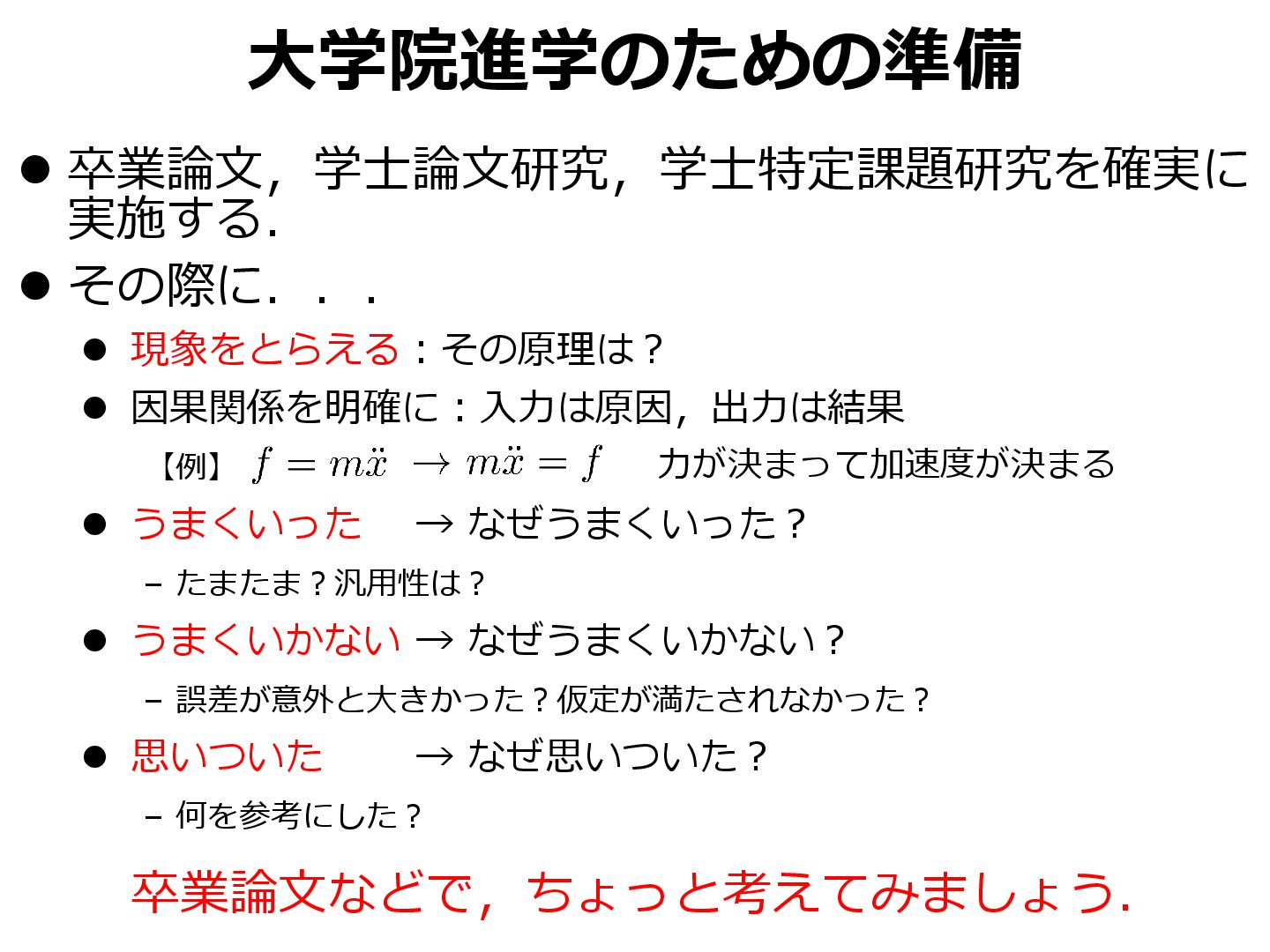 ⚫ うまくいった → なぜうまくいった? – たまたま?汎用性は? ⚫ うまくいかない → なぜうまくいかない? – 誤差が意外と大きかった?仮定が満たされなかった? ⚫ 思いついた → なぜ思いついた? – 何を参考にした? 大学院進学のための準備 力が決まって加速度が決まる 卒業論文などで,ちょっと考えてみましょう.