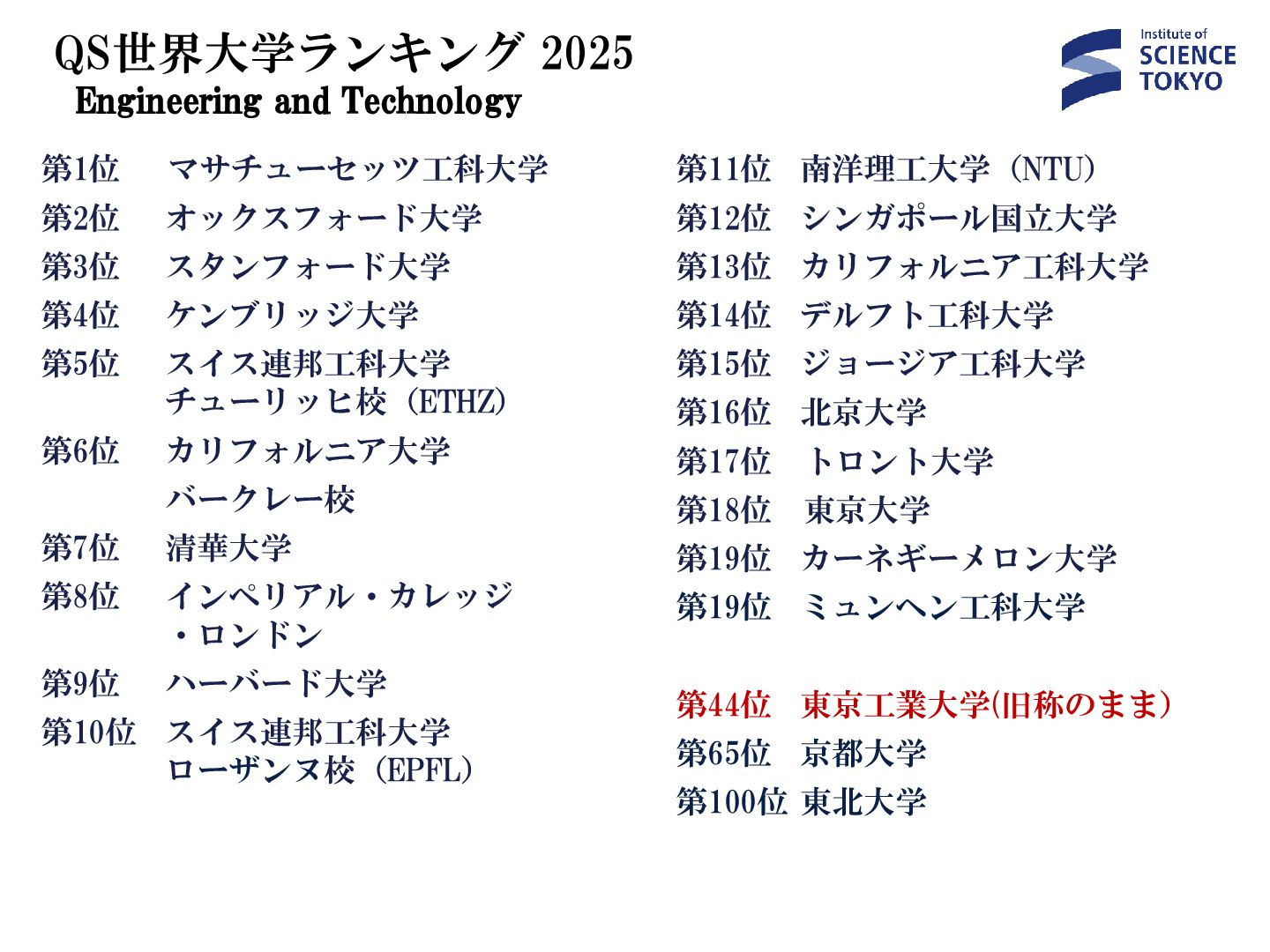 QS世界大学ランキング 2025 Engineering and Technology 第1位 マサチューセッツ工科大学 第2位 オックスフォード大学 第3位