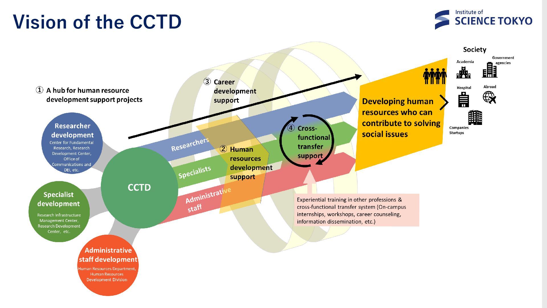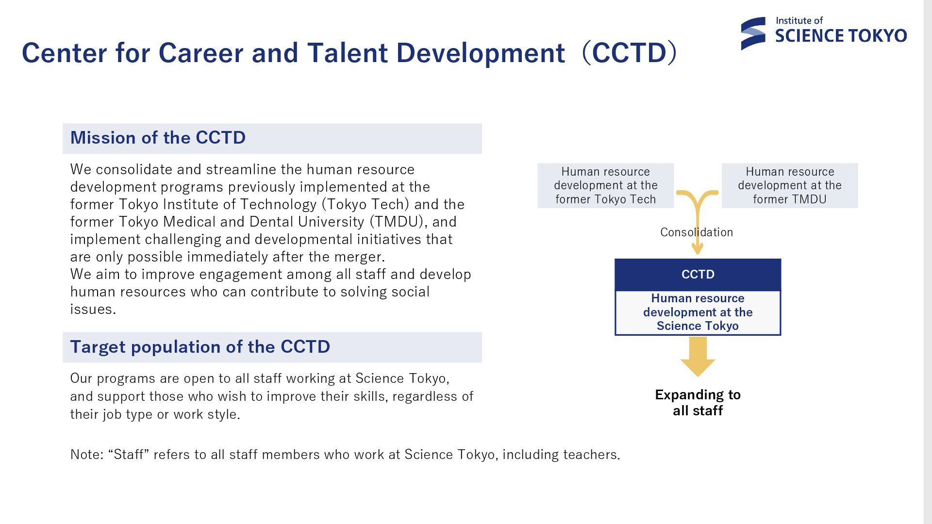 the human resource development programs previously implemented at the former Tokyo Institute of Technology (Tokyo Tech) and the former Tokyo Medical and Dental University (TMDU), and implement challenging and developmental initiatives that are only possible immediately after the merger. We aim to improve engagement among all staff and develop human resources who can contribute to solving social issues. Human resource development at the former Tokyo Tech Human resource development at the former TMDU Human resource development at the Science Tokyo CCTD Consolidation Expanding to all staff Mission of the CCTD Target population of the CCTD Our programs are open to all staff working at Science Tokyo, and support those who wish to improve their skills, regardless of their job type or work style. Note: “Staff” refers to all staff members who work at Science Tokyo, including teachers.