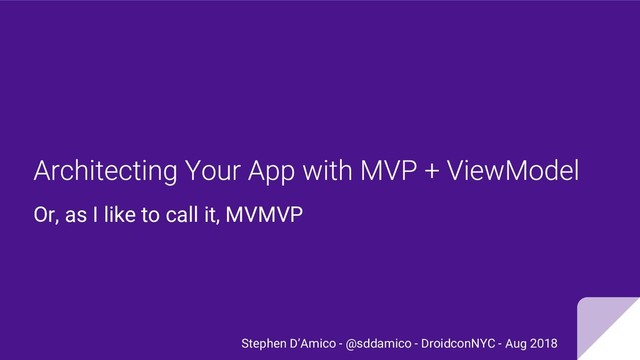 classes to create first Abstract Presenter, you'll note the type params. This time we have a State object and a ViewModel that will act as a container for it To that end, there's an abstract ViewModel to use Finally, we have our base presenter which also implements our "reducer" queue, more on that in a bit interface MvmvpPresenter<State, out VM: MvmvpViewModel<State>> { val viewModel: VM } abstract class MvmvpViewModel<State>(initialState: State) : ViewModel() { val state = BehaviorRelay.createDefault(initialState)!! } abstract class MvmvpPresenterBase<State, out VM: MvmvpViewModel<State>>(override val viewModel: VM) : MvmvpPresenter<State, VM> { @SuppressLint("CheckResult") fun sendToViewModel(reducer: (State) -> State) { Observable.just(reducer) .observeOn(AndroidSchedulers.mainThread()) // ensures // mutations happen serially on main thread .zipWith(viewModel.state) .map { (reducer, state) -> reducer.invoke(state) } .subscribe(viewModel.state) } }