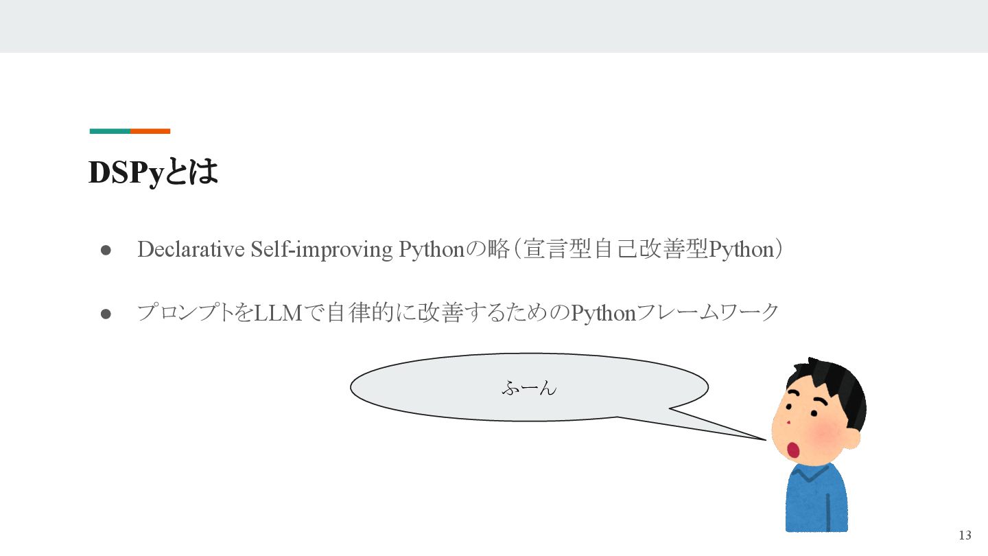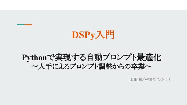 このトークのテーマは、プロンプト調整の“属人化”を打破し、モデル変更にもしなやかに追従できる新時代の自動プロンプト最適化フレームワーク“DSPy(Declarative Self-improving Python)”の紹介です。