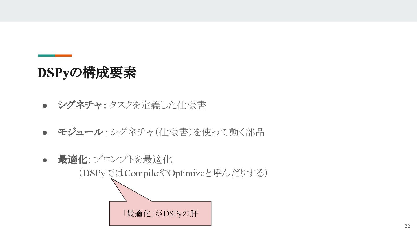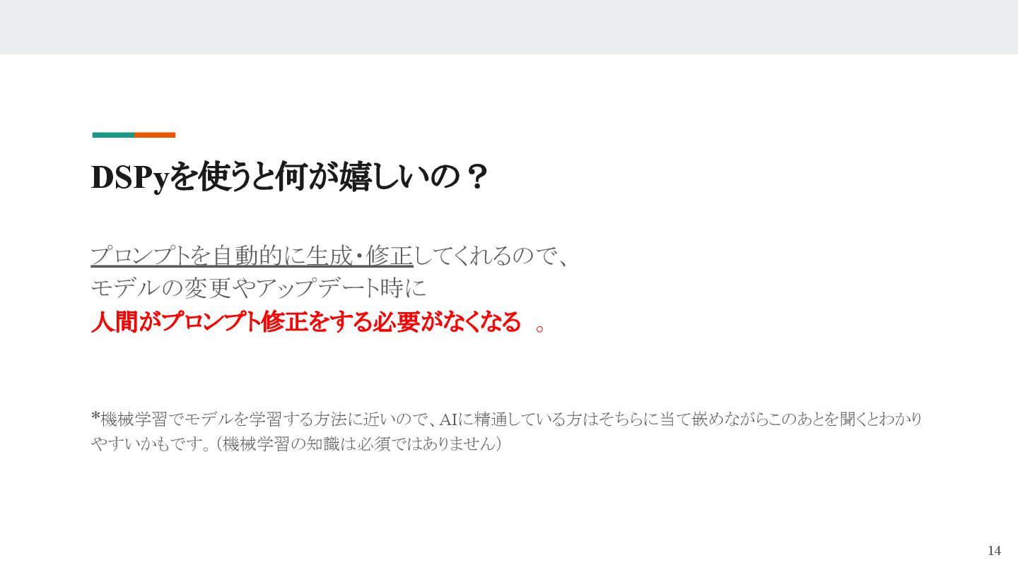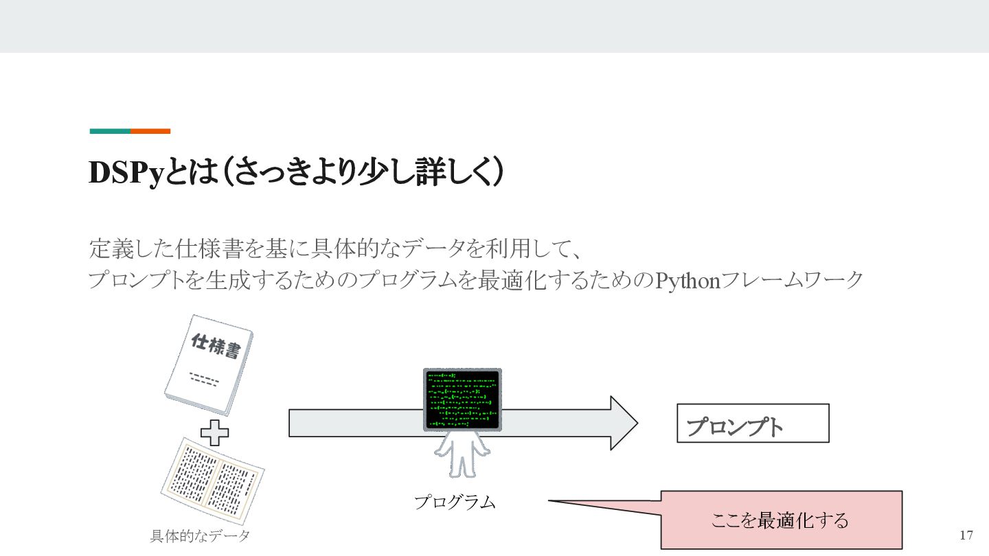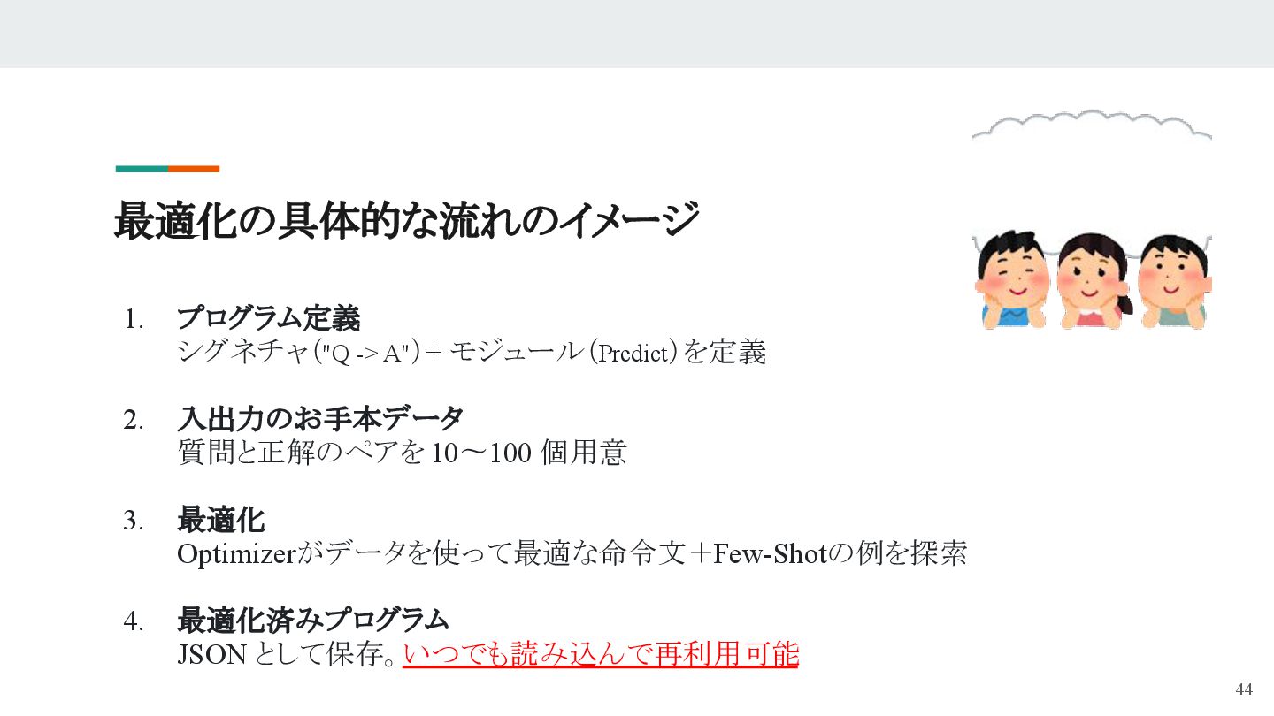 - DSPyでは、仕様と変換例を与えることで、モデル特性を学習し、自律的に最適プロンプトを生成することができます。