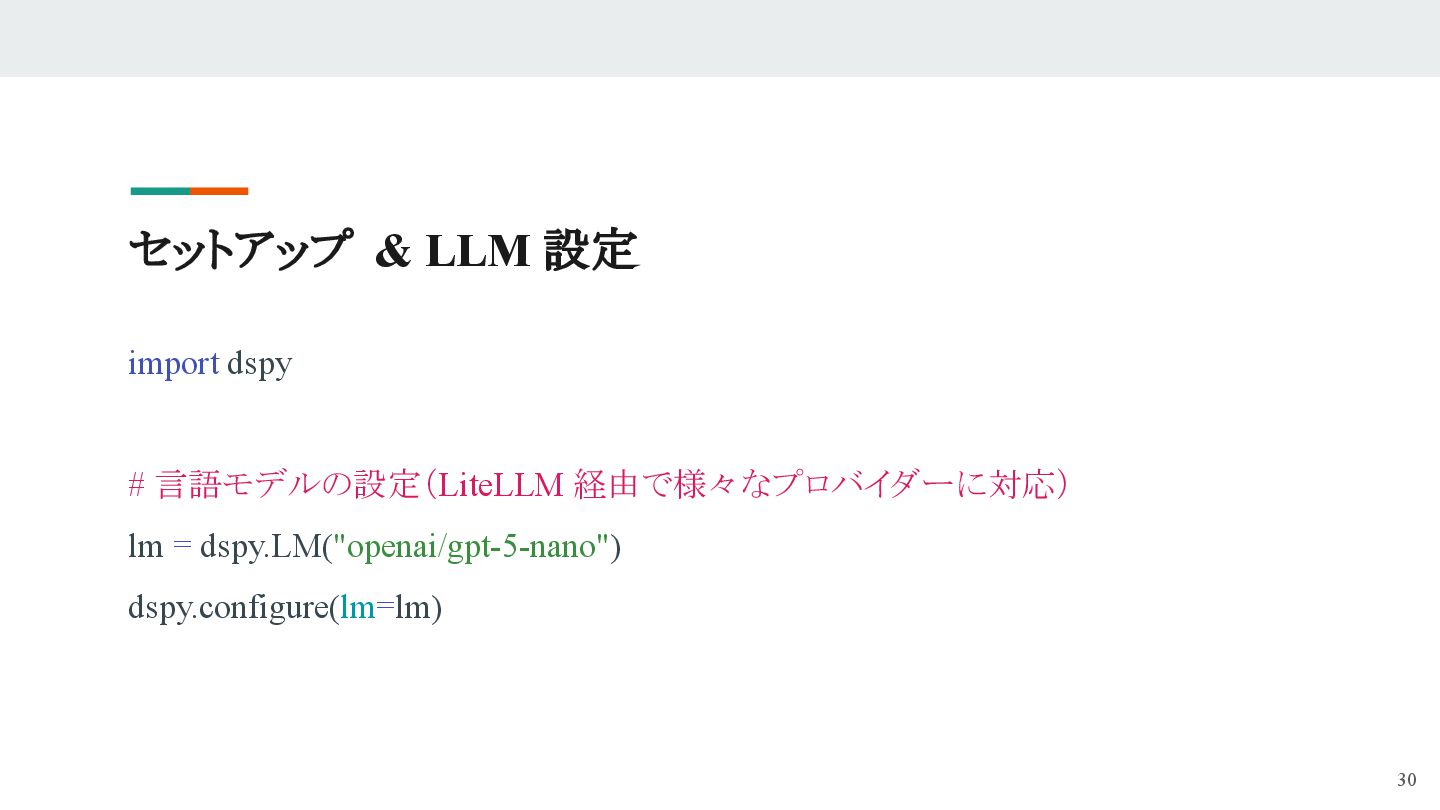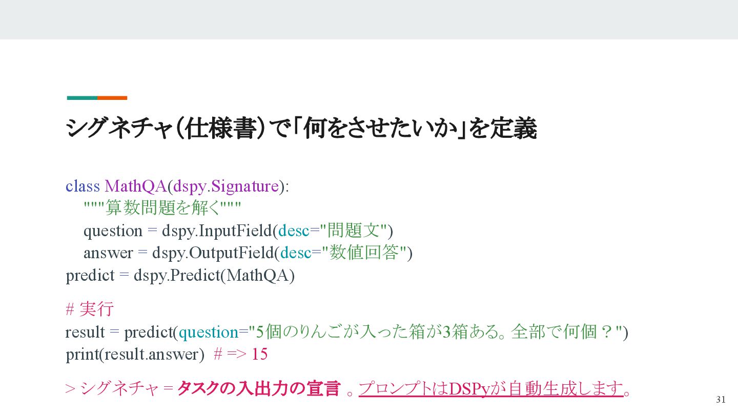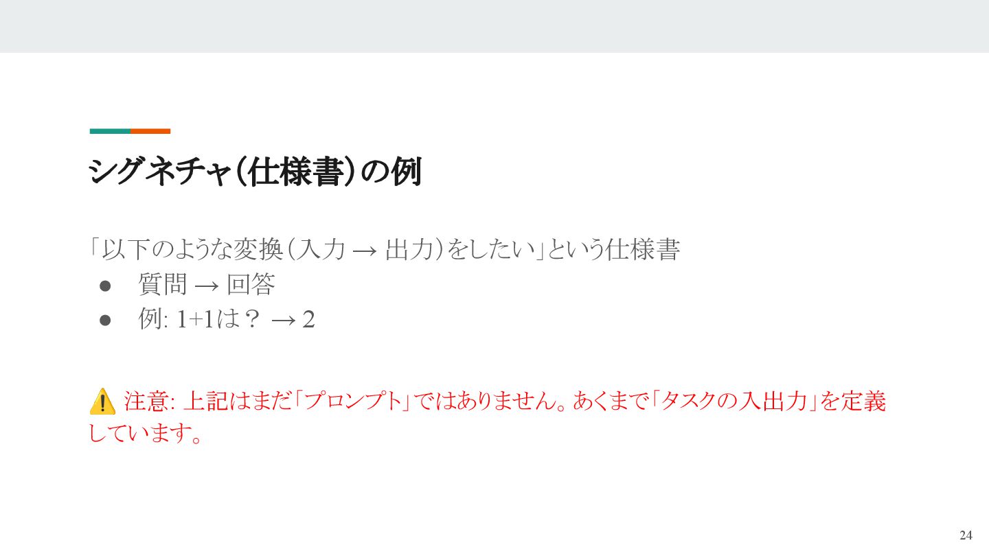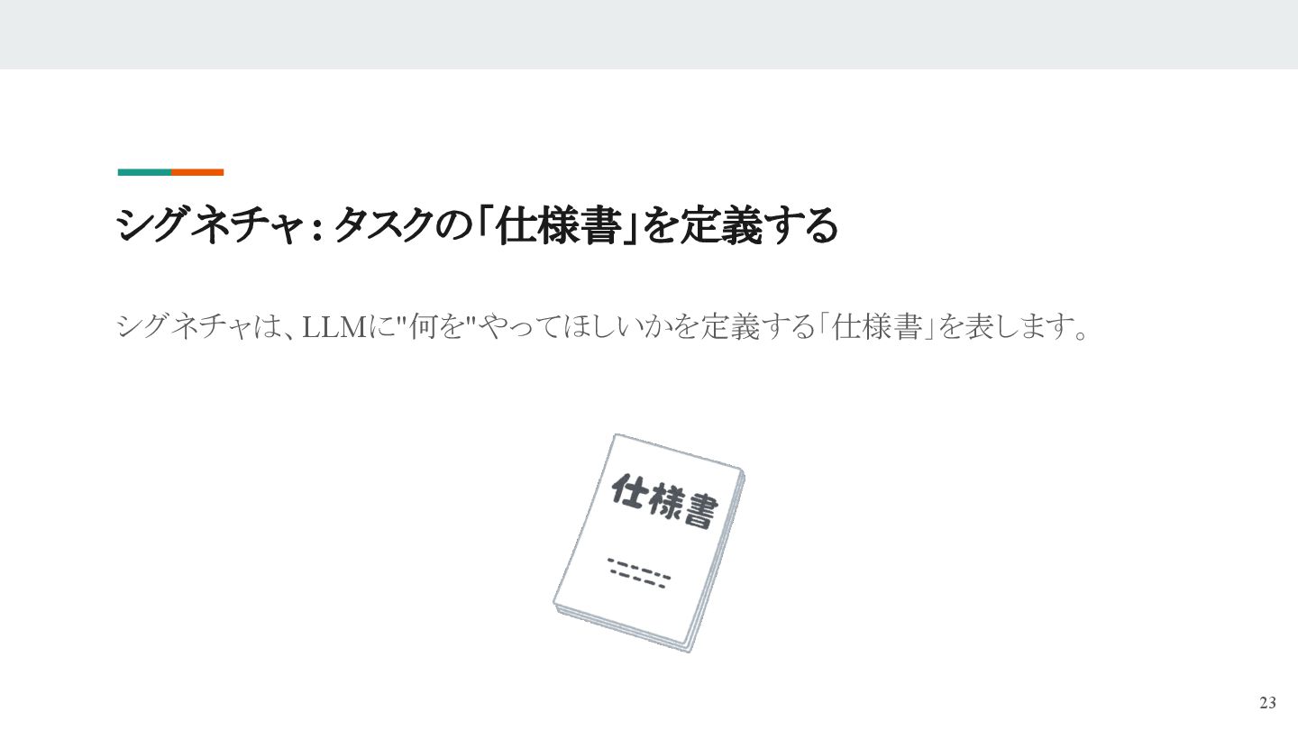 - DSPyでは、仕様と変換例を与えることで、モデル特性を学習し、自律的に最適プロンプトを生成することができます。