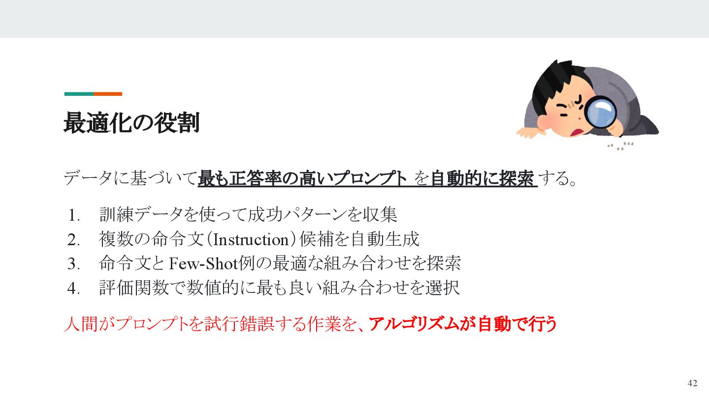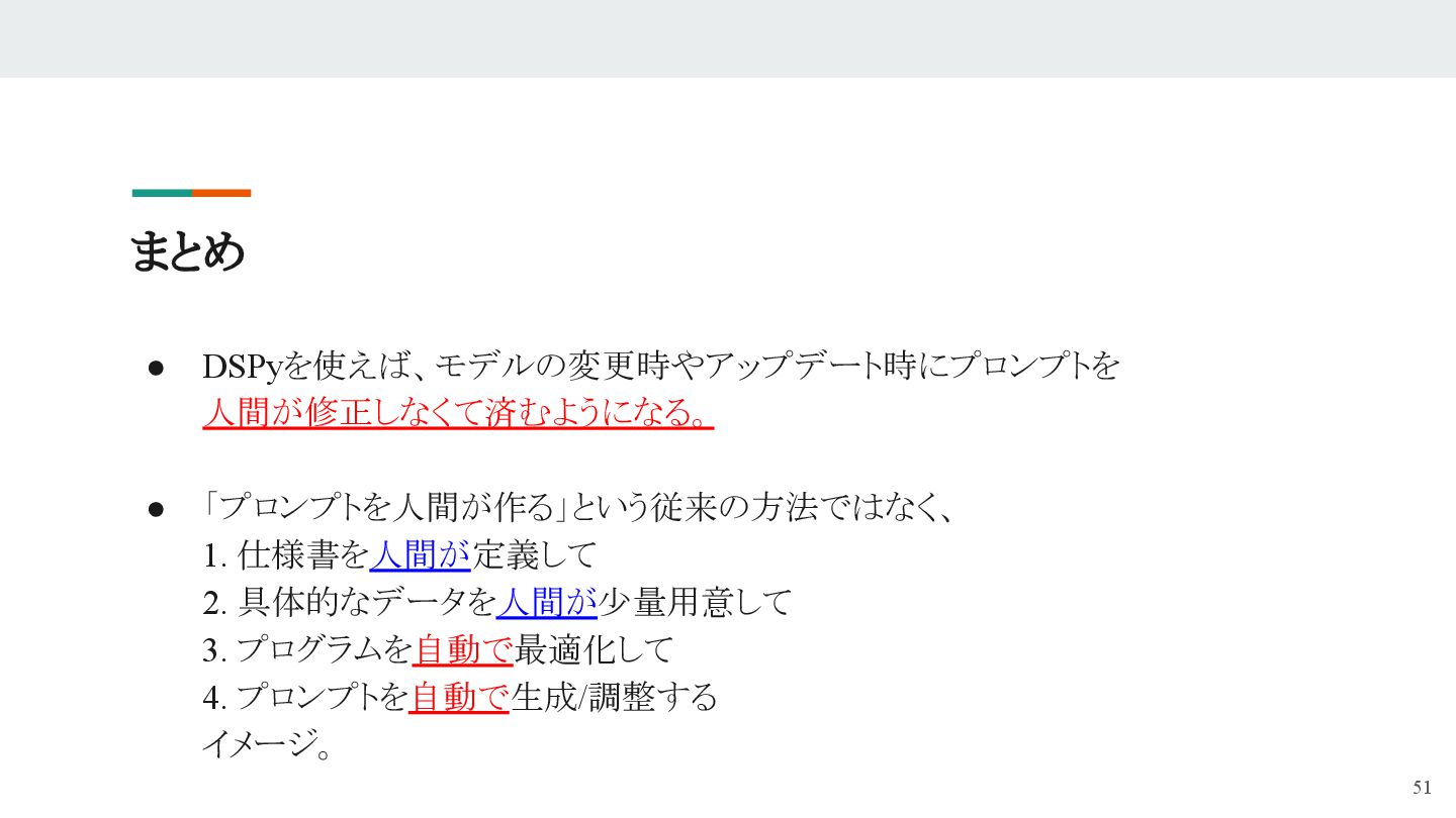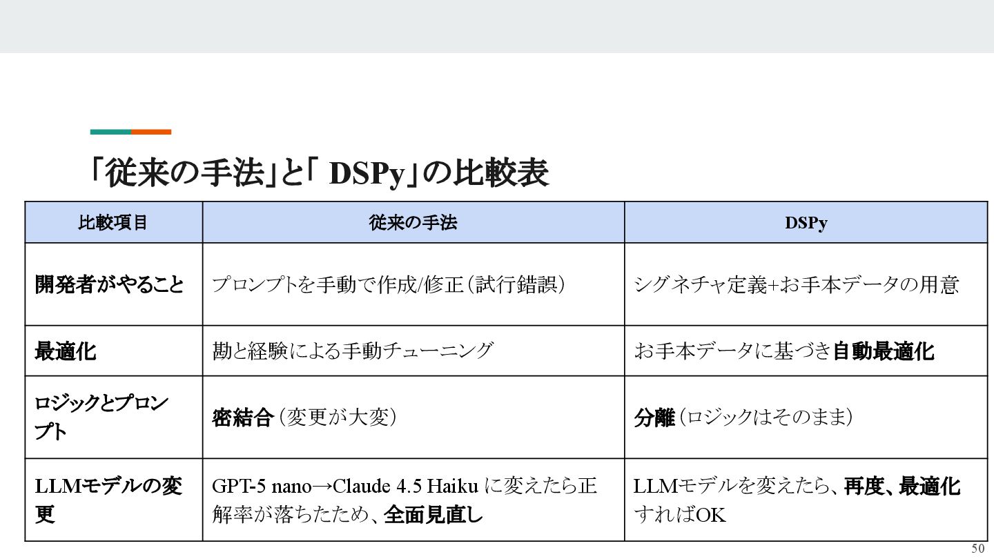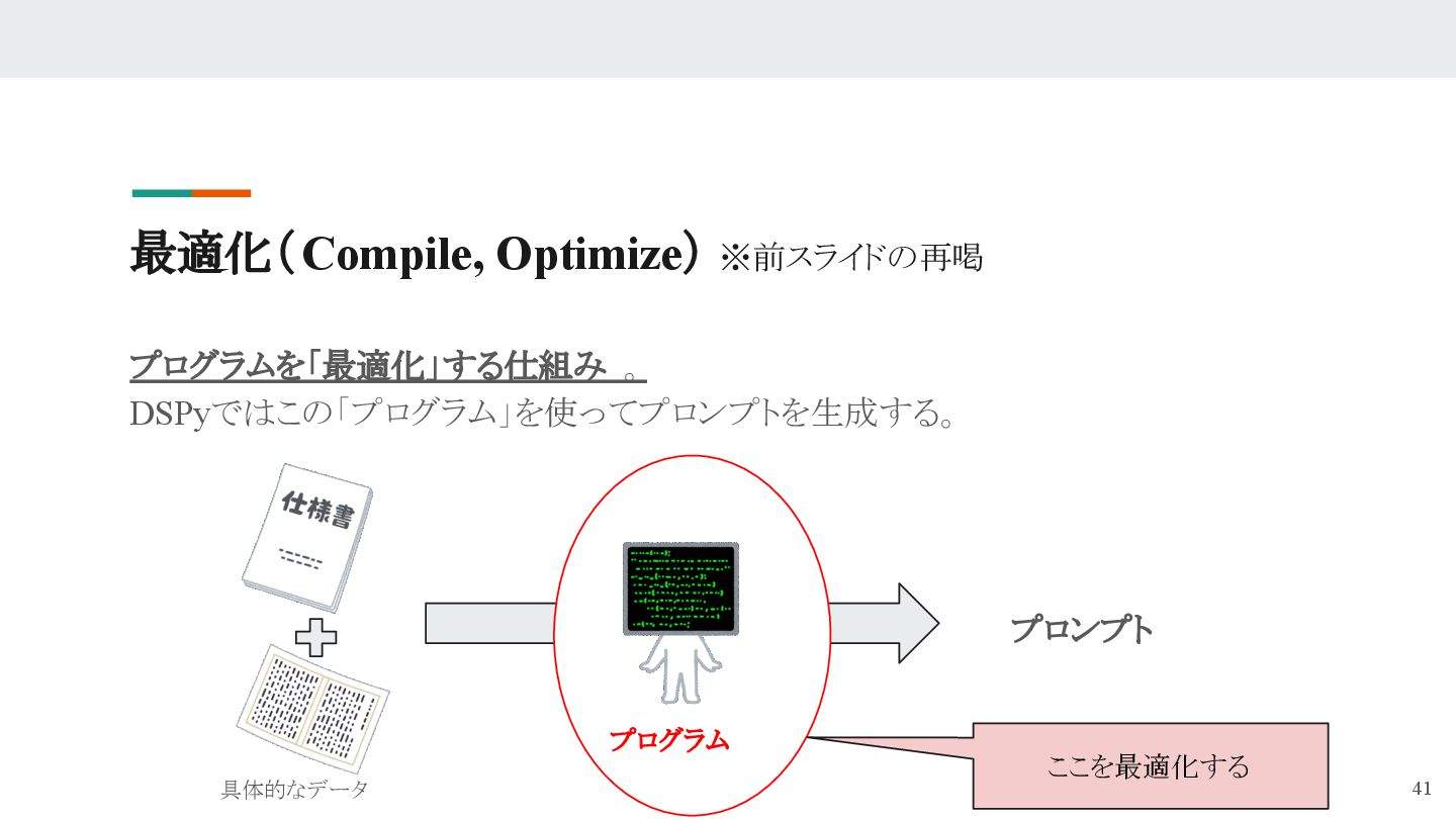 - DSPyが効率よく「最適なプロンプト」を探索し、人手不要で最適化