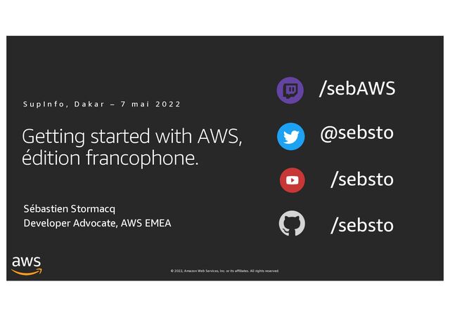 rights reserved. Getting started with AWS, édition francophone. S u p I n f o , D a k a r – 7 m a i 2 0 2 2 Sébastien Stormacq Developer Advocate, AWS EMEA @sebsto /sebsto /sebsto /sebAWS