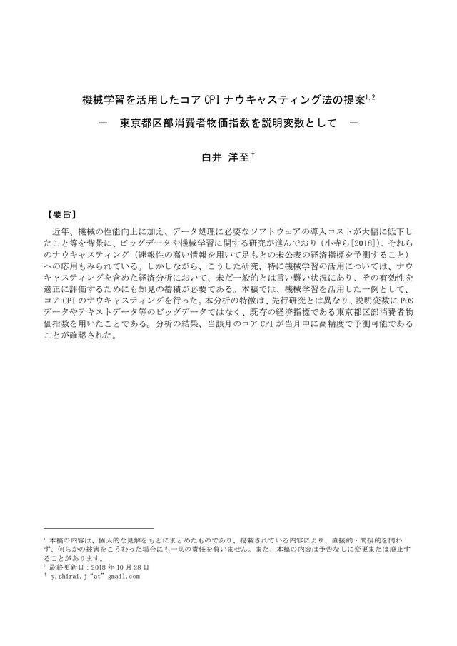 たこと等を背景に、ビッグデータや機械学習に関する研究が進んでおり(小寺ら[2018]) 、それら のナウキャスティング(速報性の高い情報を用いて足もとの未公表の経済指標を予測すること) への応用もみられている。しかしながら、こうした研究、特に機械学習の活用については、ナウ キャスティングを含めた経済分析において、未だ一般的とは言い難い状況にあり、その有効性を 適正に評価するためにも知見の蓄積が必要である。本稿では、機械学習を活用した一例として、 コア CPI のナウキャスティングを行った。 本分析の特徴は、 先行研究とは異なり、 説明変数に POS データやテキストデータ等のビッグデータではなく、既存の経済指標である東京都区部消費者物 価指数を用いたことである。分析の結果、当該月のコア CPI が当月中に高精度で予測可能である ことが確認された。 1 本稿の内容は、個人的な見解をもとにまとめたものであり、掲載されている内容により、直接的・間接的を問わ ず、何らかの被害をこうむった場合にも一切の責任を負いません。また、本稿の内容は予告なしに変更または廃止す ることがあります。 2 最終更新日:2018 年 10 月 28 日 † y.shirai.j“at”gmail.com