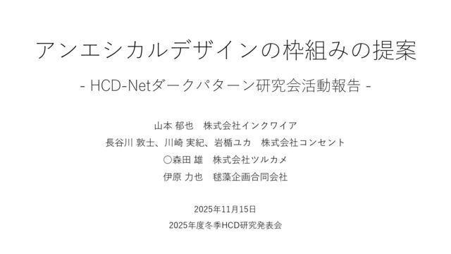 上記イベントの口頭発表「アンエシカルデザインの枠組みの提案 - HCD-Net ダークパターン研究会活動 報告 -」にて使用したスライドを公開用に編集したものです。