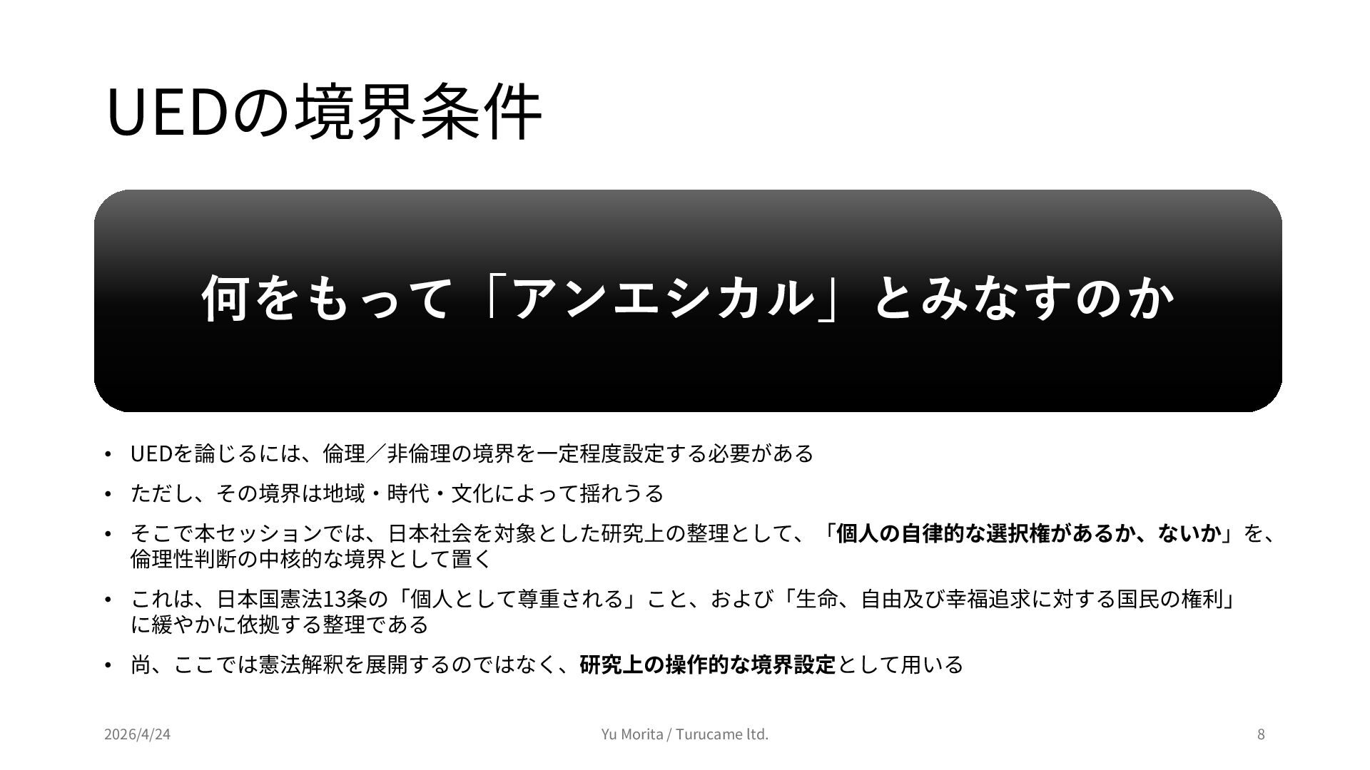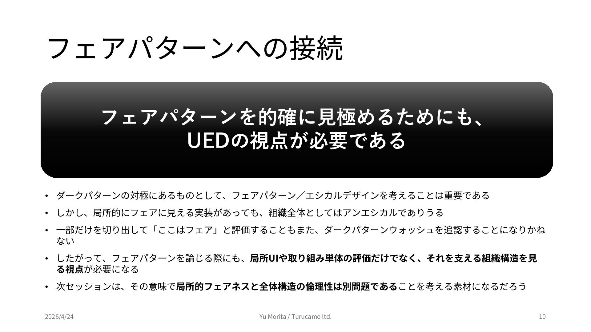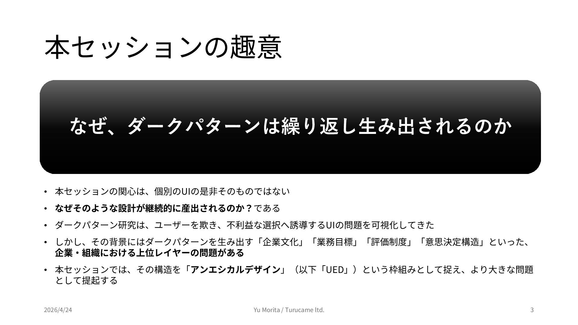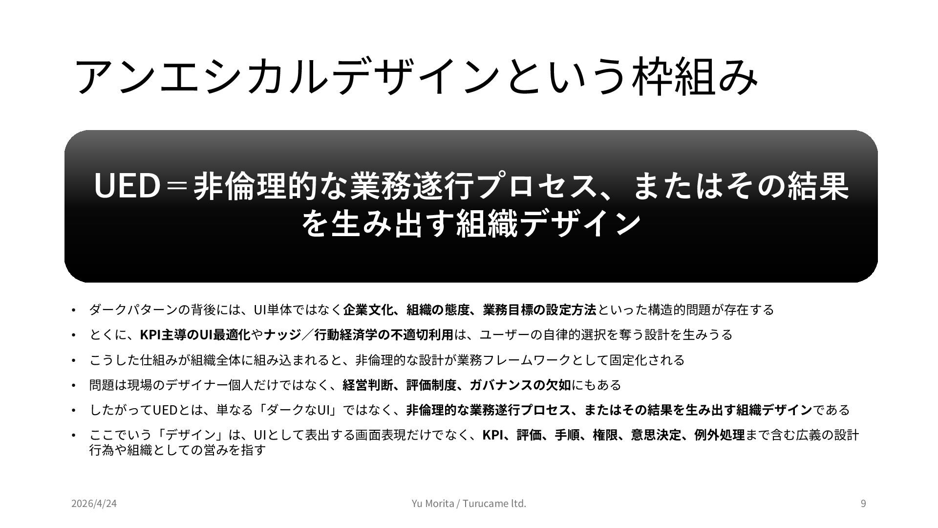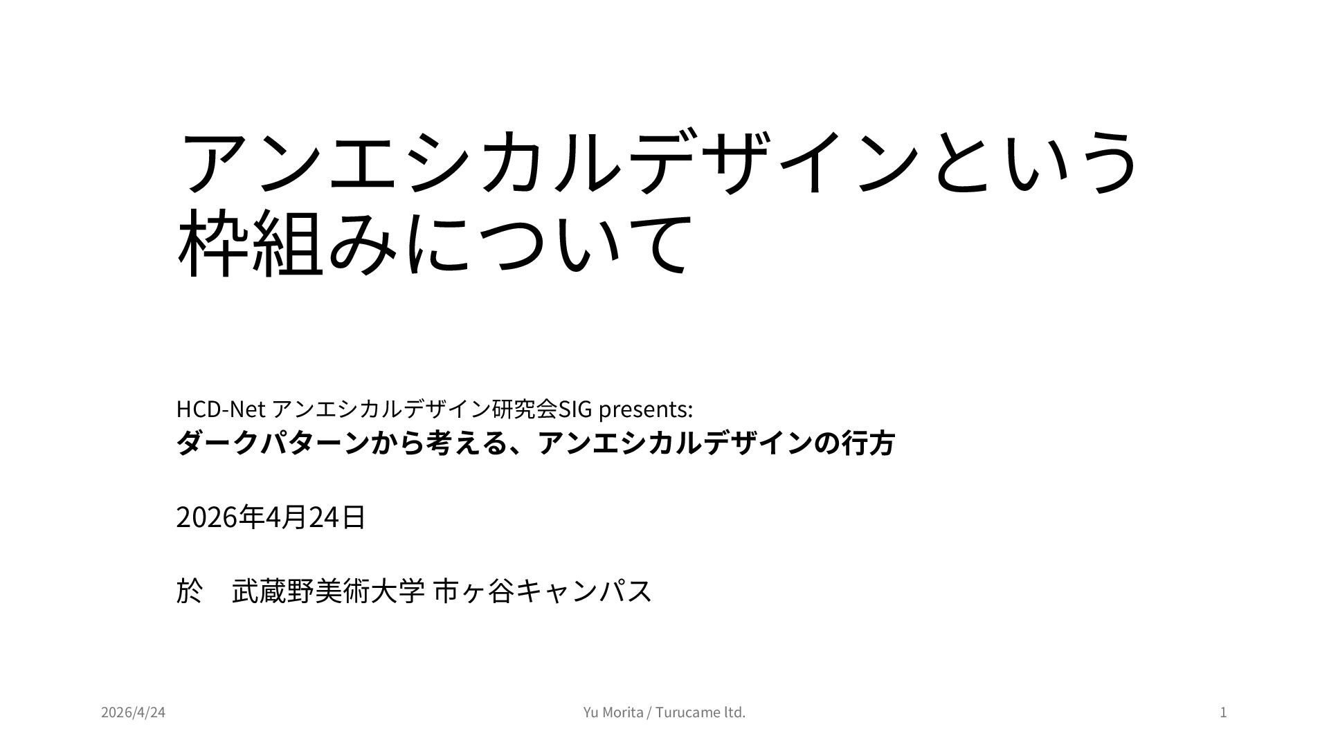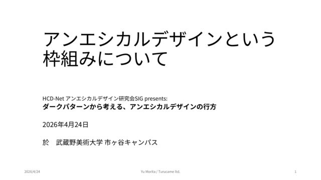 ダークパターンから考える、アンエシカルデザインの行方 (2026年4月24日開催) https://peatix.com/event/4944732 上記イベントのセッション「アンエシカルデザインという枠組みについて」にて使用したスライドを公開用に編集したものです。