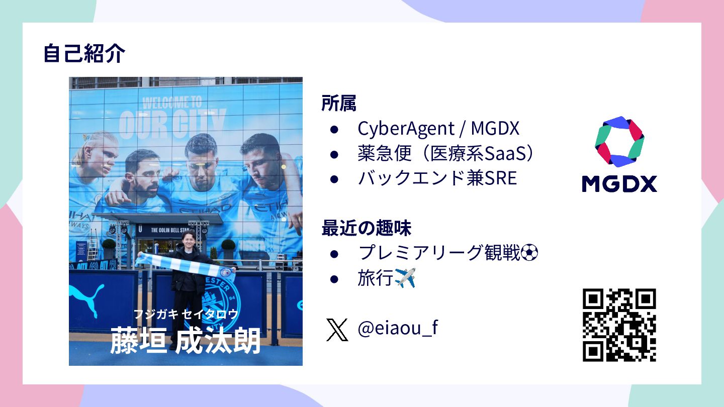 自己紹介 所属 • CyberAgent / MGDX • 薬急便(医療系SaaS) • バックエンド兼SRE