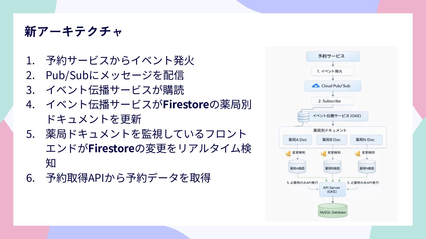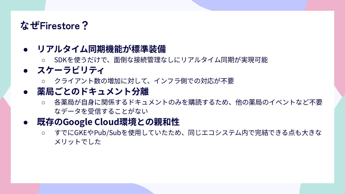 薬局ごとのドキュメント分離 ◦ 各薬局が⾃⾝に関係するドキュメントのみを購読するため、他の薬局のイベントなど不要 なデータを受信することがない • 既存のGoogle Cloud環境との親和性 ◦ すでにGKEやPub/Subを使⽤していたため、同じエコシステム内で完結できる点も⼤きな メリットでした