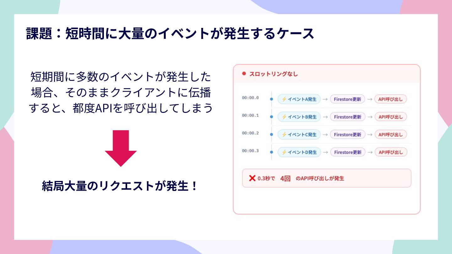 短期間に多数のイベントが発⽣した 場合、そのままクライアントに伝播 すると、都度APIを呼び出してしまう 結局⼤量のリクエストが発⽣! 課題:短時間に⼤量のイベントが発⽣するケース