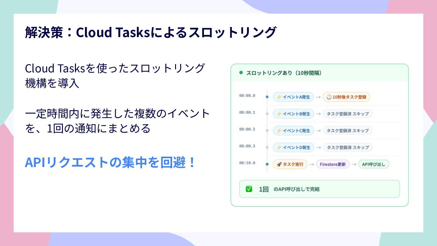 Cloud Tasksを使ったスロットリング 機構を導⼊ ⼀定時間内に発⽣した複数のイベント を、1回の通知にまとめる APIリクエストの集中を回避! 解決策:Cloud Tasksによるスロットリング