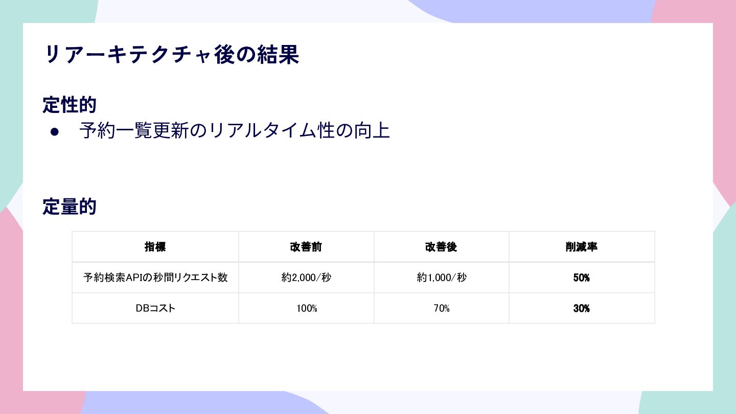 リアーキテクチャ後の結果 定性的 • 予約⼀覧更新のリアルタイム性の向上 定量的 指標 改善前 改善後 削減率 予約検索APIの秒間リクエスト数