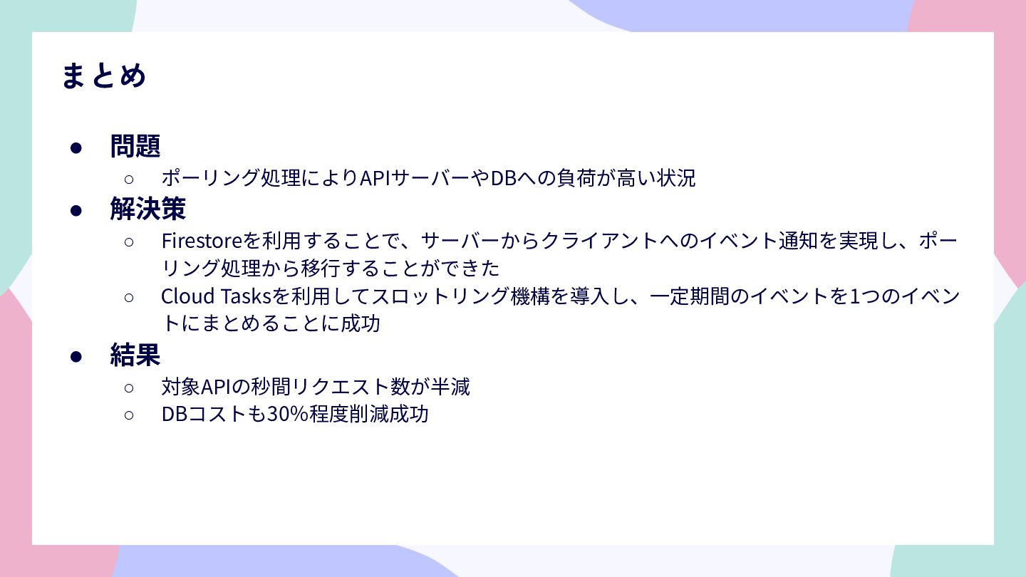 • 問題 ◦ ポーリング処理によりAPIサーバーやDBへの負荷が⾼い状況 • 解決策 ◦ Firestoreを利⽤することで、サーバーからクライアントへのイベント通知を実現し、ポー リング処理から移⾏することができた ◦