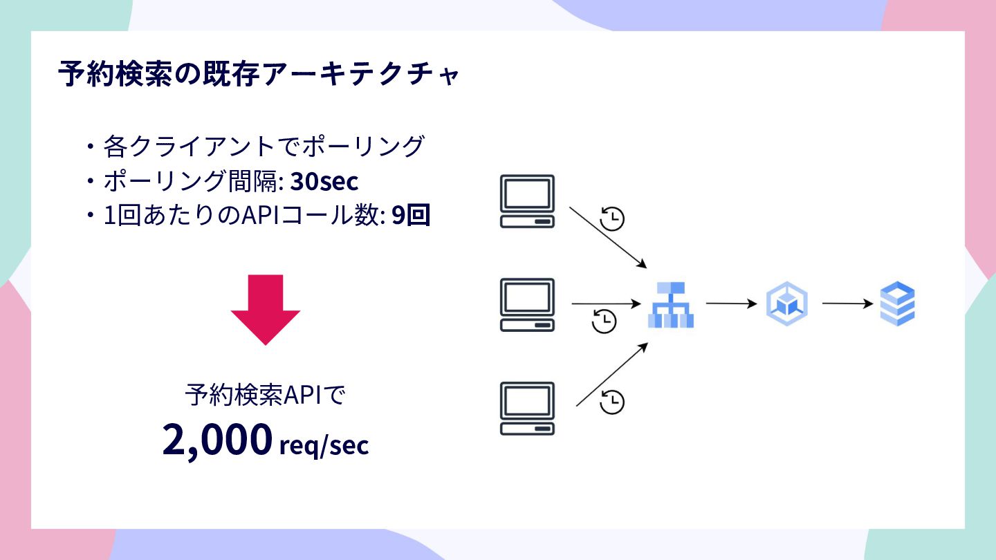 予約検索の既存アーキテクチャ ‧各クライアントでポーリング ‧ポーリング間隔: 30sec ‧1回あたりのAPIコール数: 9回 予約検索APIで 2,000 req/sec