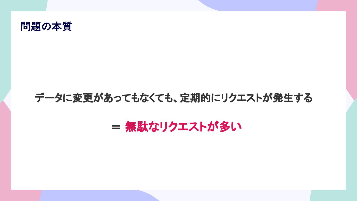 問題の本質 データに変更があってもなくても、定期的にリクエストが発生する = 無駄なリクエストが多い