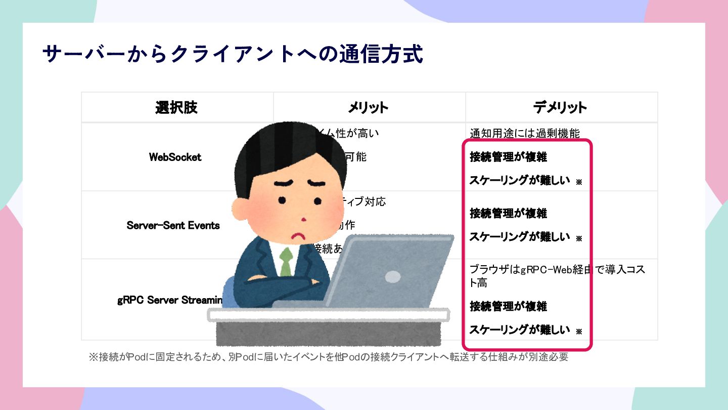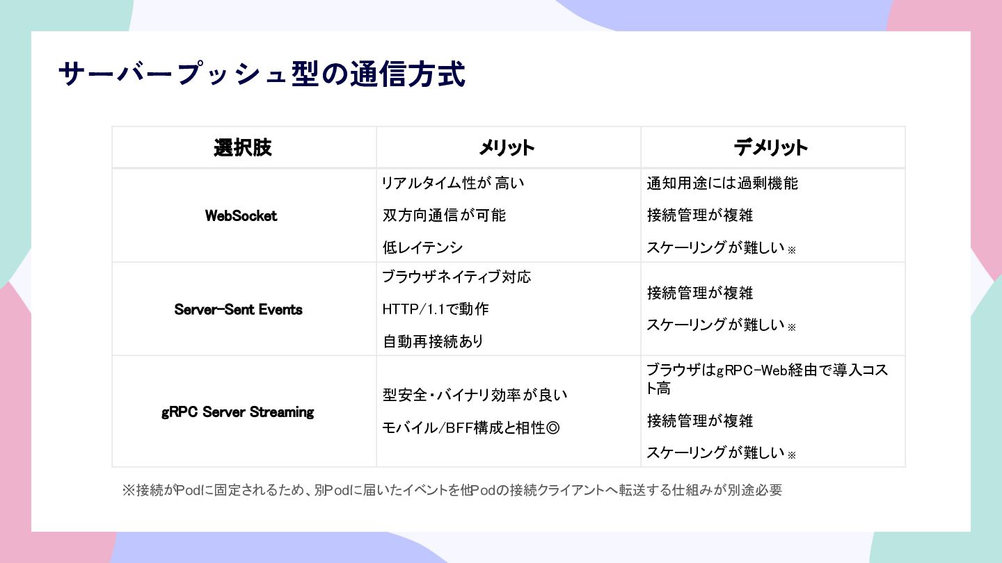 スケーリングが難しい ※ Server-Sent Events ブラウザネイティブ対応 HTTP/1.1で動作 自動再接続あり 接続管理が複雑 スケーリングが難しい ※ gRPC Server Streaming 型安全・バイナリ効率が良い モバイル/BFF構成と相性◎ ブラウザはgRPC-Web経由で導入コス ト高 接続管理が複雑 スケーリングが難しい ※ ※接続がPodに固定されるため、別 Podに届いたイベントを他 Podの接続クライアントへ転送する仕組みが別途必要