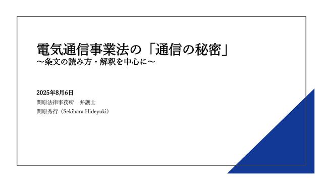 電気通信事業法の「通信の秘密」 ~条文の読み方・解釈を中心に~ 2025年8月6日 関原法律事務所 弁護士 関原秀行(Sekihara Hideyuki)