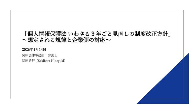 「個人情報保護法 いわゆる3年ごと見直しの制度改正方針」 ~想定される規律と企業側の対応~ 2026年1月14日 関原法律事務所 弁護士 関原秀行(Sekihara Hideyuki)