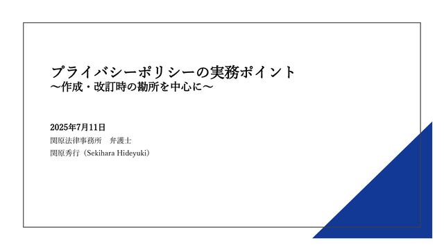 プライバシーポリシーの実務ポイント ~作成・改訂時の勘所を中心に~ 2025年7月11日 関原法律事務所 弁護士 関原秀行(Sekihara Hideyuki)