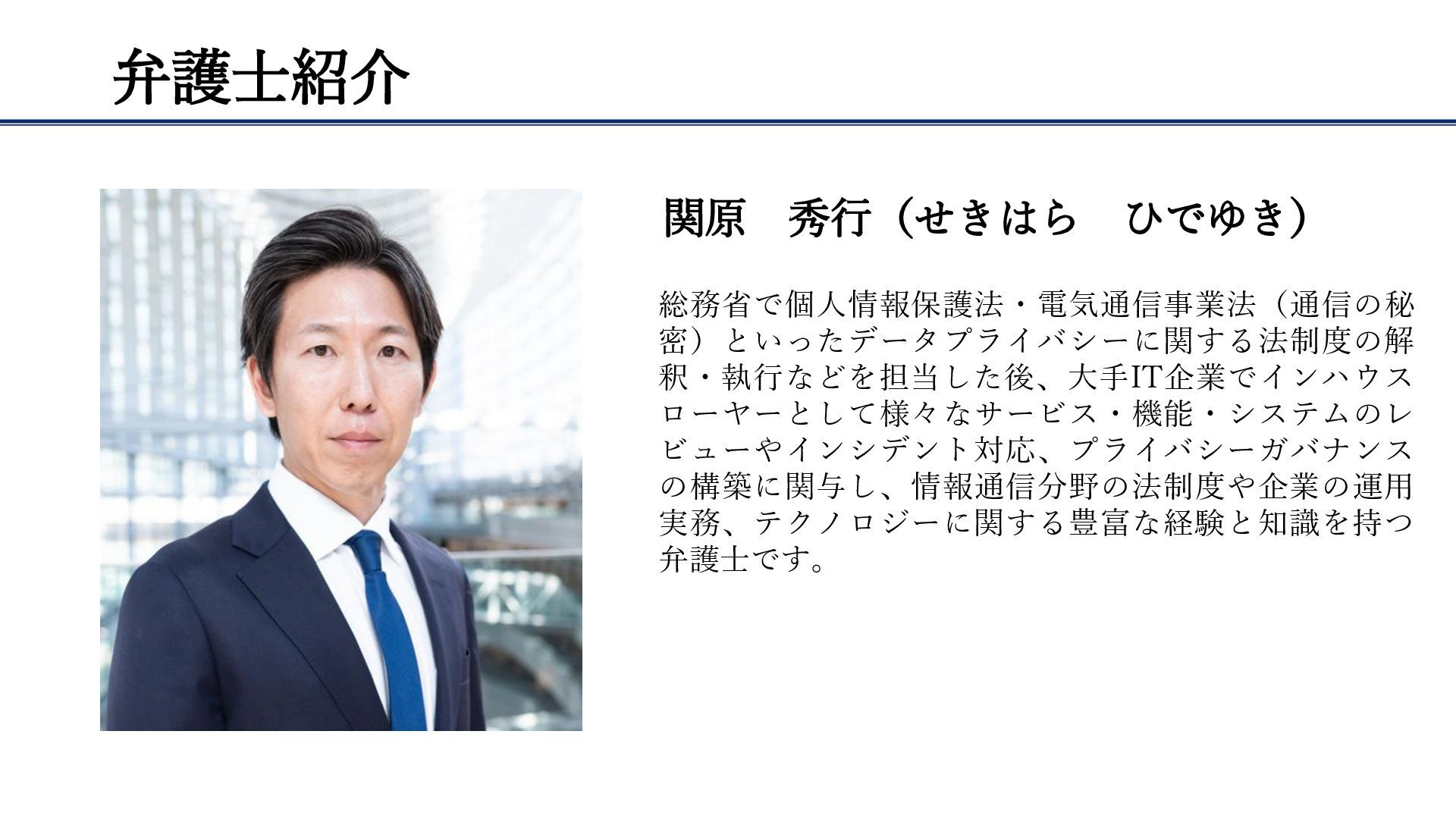 弁護士紹介 関原 秀行(せきはら ひでゆき) 総務省で個人情報保護法・電気通信事業法(通信の秘 密)といったデータプライバシーに関する法制度の解 釈・執行などを担当した後、大手IT企業でインハウス ローヤーとして様々なサービス・機能・システムのレ ビューやインシデント対応、プライバシーガバナンス の構築に関与し、情報通信分野の法制度や企業の運用