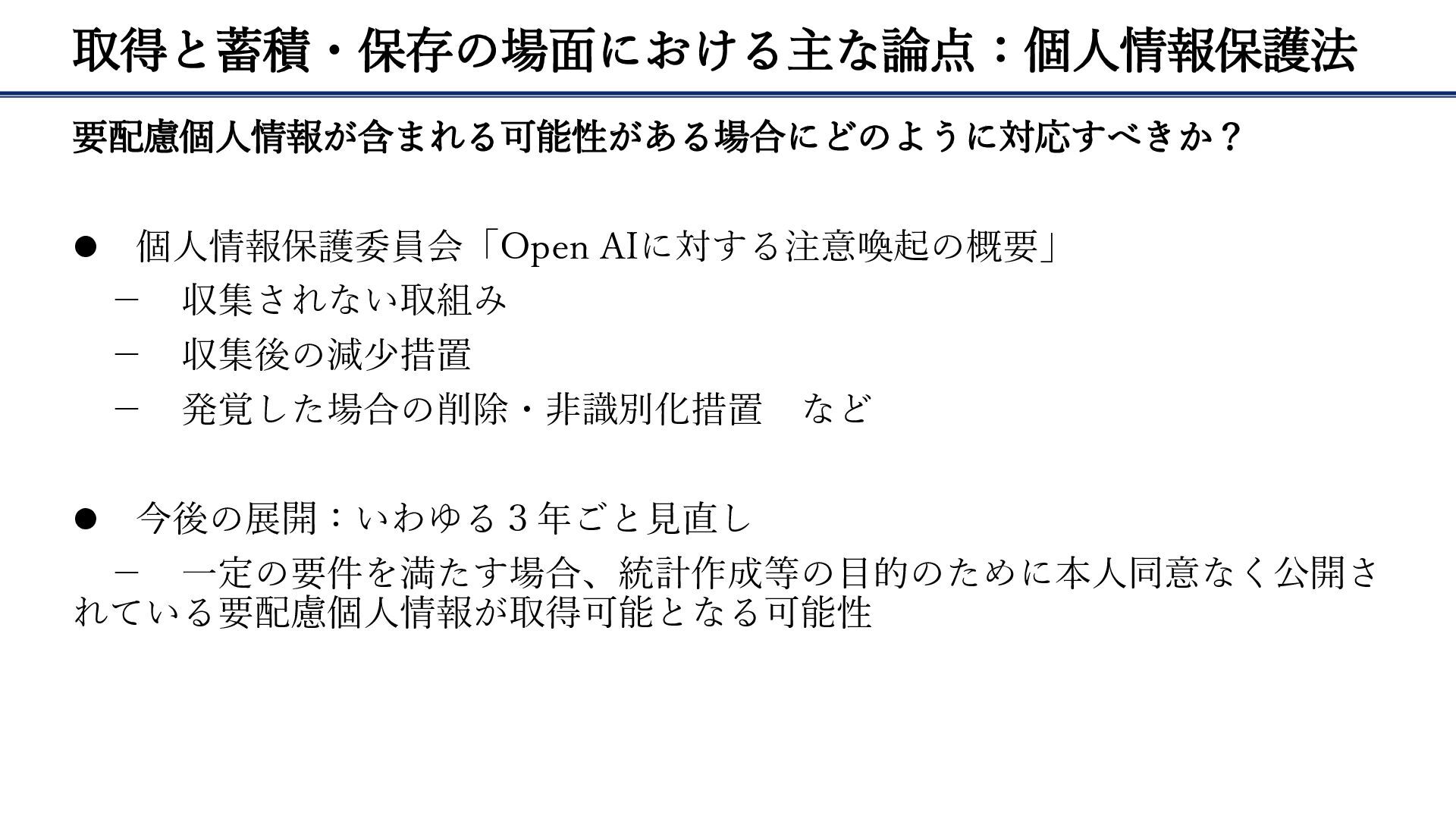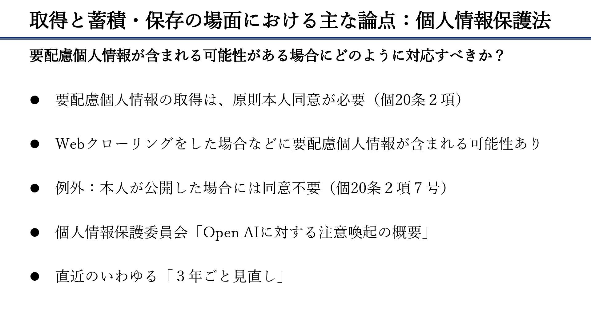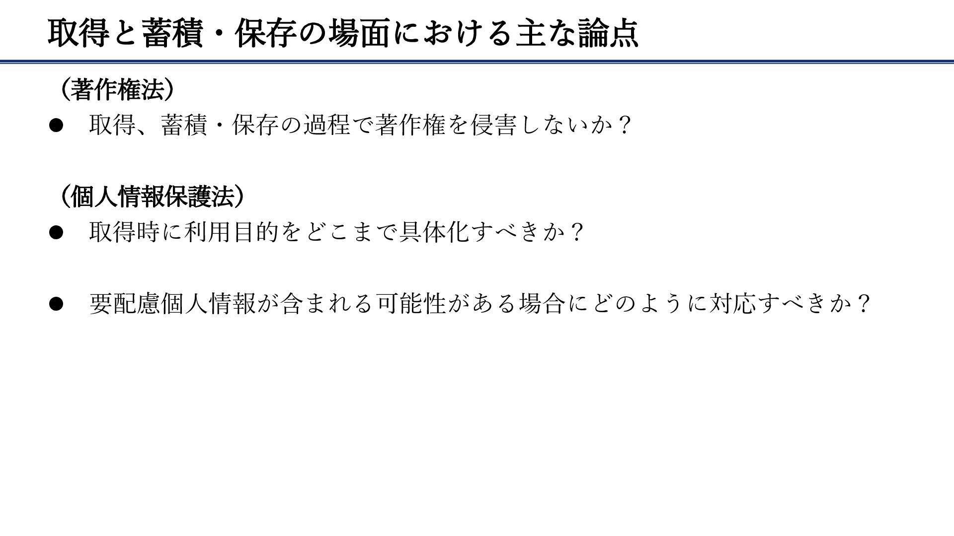 取得と蓄積・保存の場面における主な論点 (著作権法) ⚫ 取得、蓄積・保存の過程で著作権を侵害しないか? (個人情報保護法) ⚫ 取得時に利用目的をどこまで具体化すべきか? ⚫ 要配慮個人情報が含まれる可能性がある場合にどのように対応すべきか?