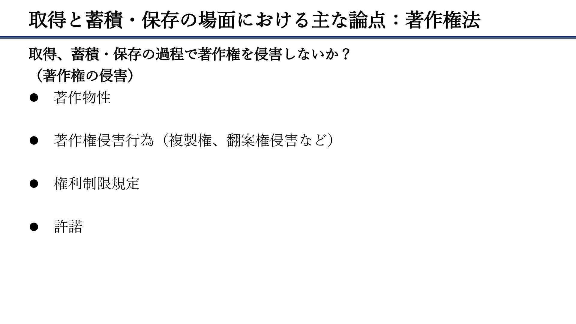 取得と蓄積・保存の場面における主な論点:著作権法 取得、蓄積・保存の過程で著作権を侵害しないか? (著作権の侵害) ⚫ 著作物性 ⚫ 著作権侵害行為(複製権、翻案権侵害など) ⚫ 権利制限規定 ⚫