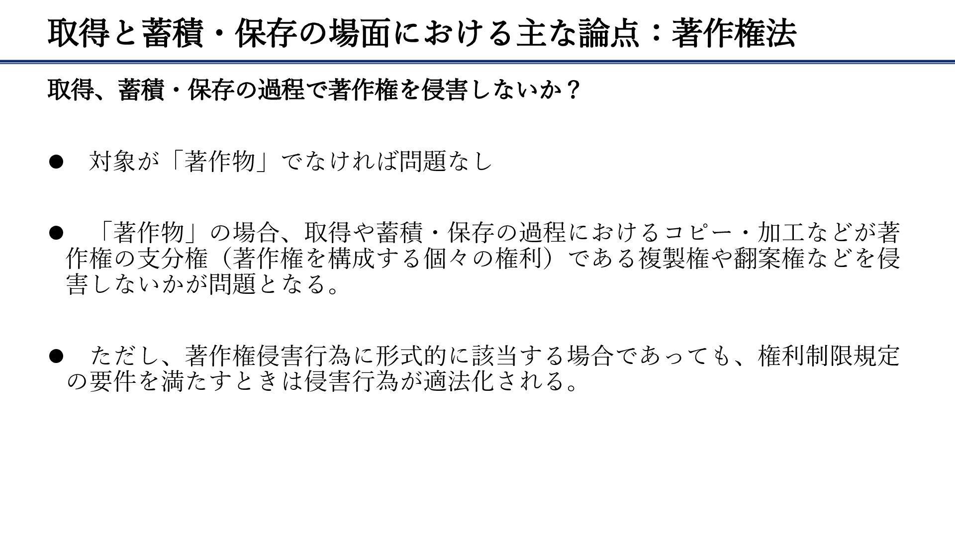 取得と蓄積・保存の場面における主な論点:著作権法 取得、蓄積・保存の過程で著作権を侵害しないか? ⚫ 対象が「著作物」でなければ問題なし ⚫ 「著作物」の場合、取得や蓄積・保存の過程におけるコピー・加工などが著 作権の支分権(著作権を構成する個々の権利)である複製権や翻案権などを侵 害しないかが問題となる。 ⚫ ただし、著作権侵害行為に形式的に該当する場合であっても、権利制限規定