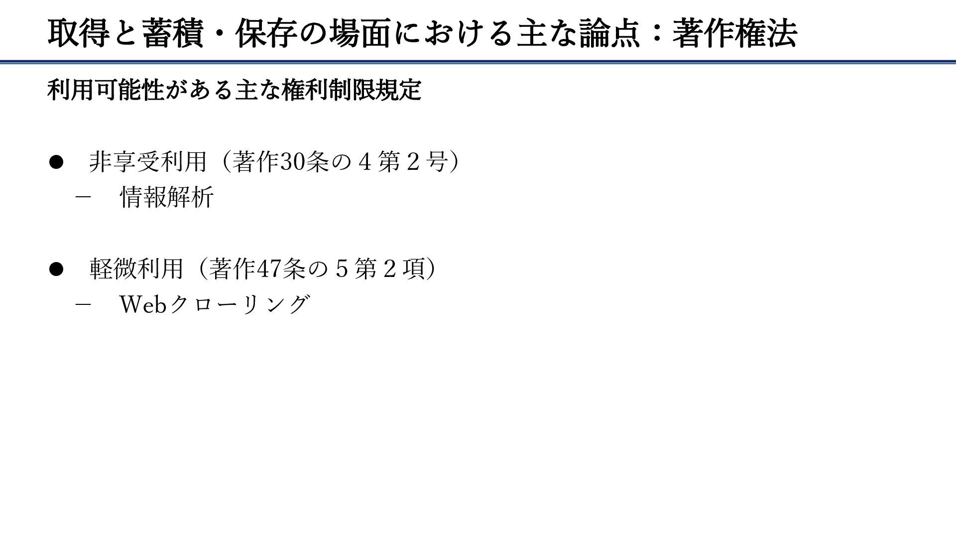 取得と蓄積・保存の場面における主な論点:著作権法 利用可能性がある主な権利制限規定 ⚫ 非享受利用(著作30条の4第2号) - 情報解析 ⚫ 軽微利用(著作47条の5第2項) - Webクローリング