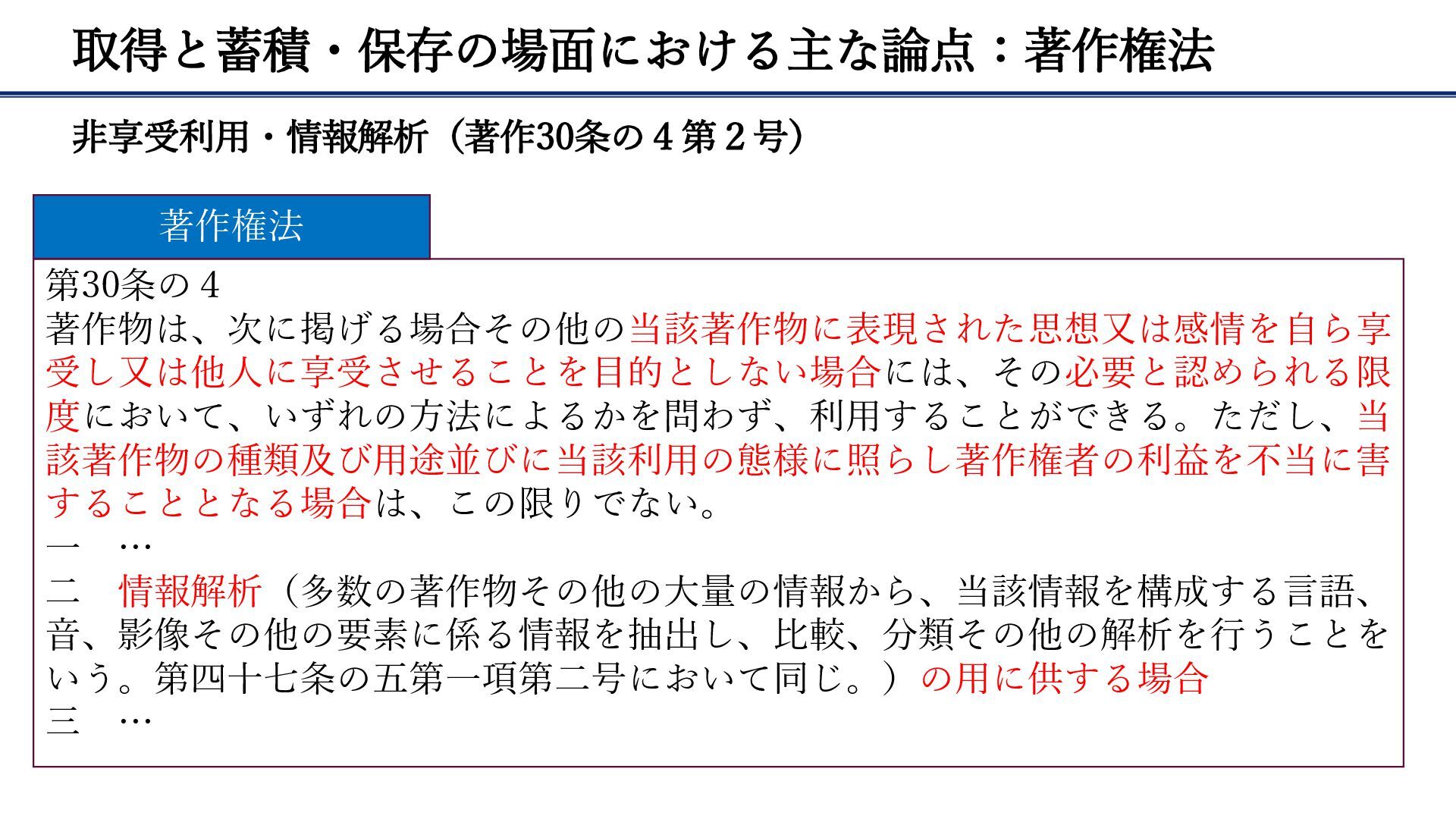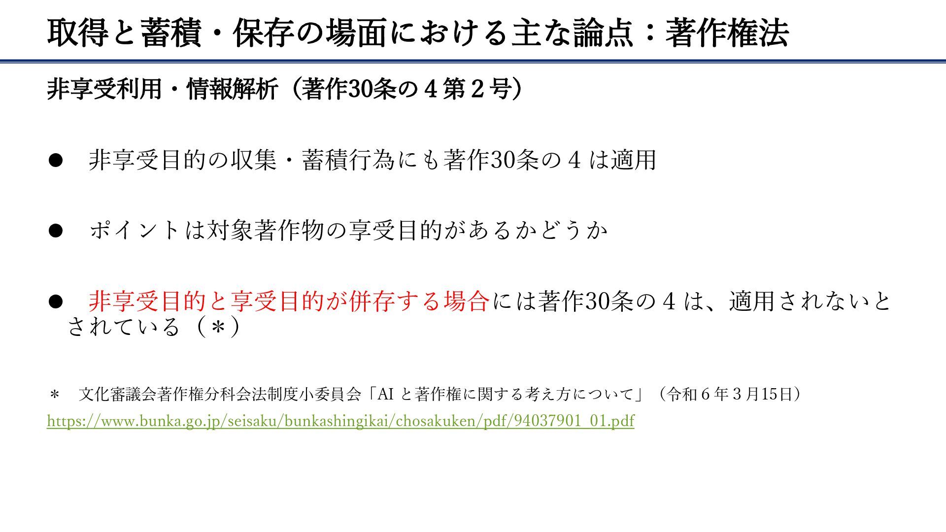 取得と蓄積・保存の場面における主な論点:著作権法 非享受利用・情報解析(著作30条の4第2号) ⚫ 非享受目的の収集・蓄積行為にも著作30条の4は適用 ⚫ ポイントは対象著作物の享受目的があるかどうか ⚫ 非享受目的と享受目的が併存する場合には著作30条の4は、適用されないと されている(*) *