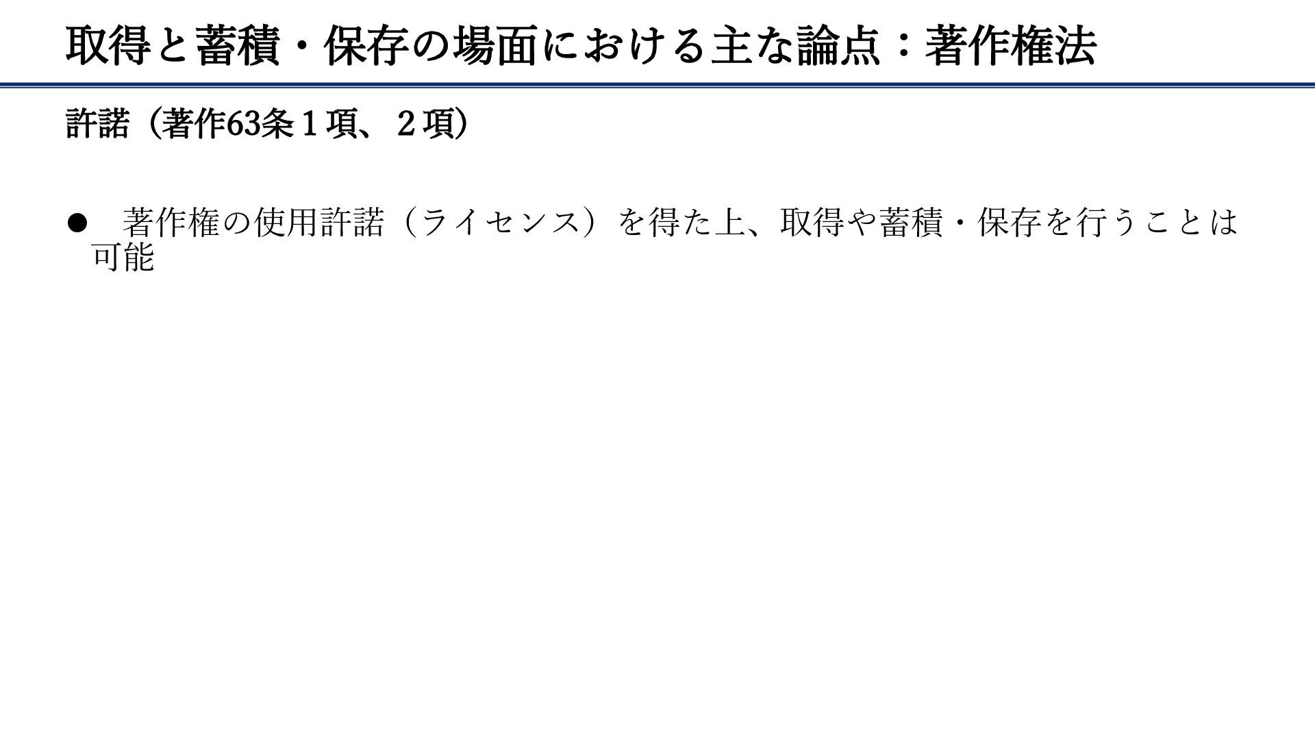 取得と蓄積・保存の場面における主な論点:著作権法 許諾(著作63条1項、2項) ⚫ 著作権の使用許諾(ライセンス)を得た上、取得や蓄積・保存を行うことは 可能