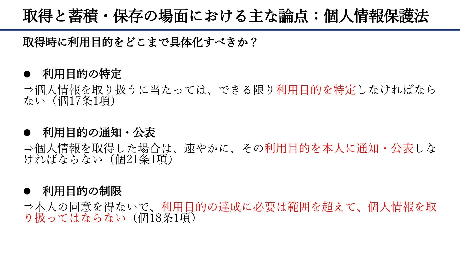 取得と蓄積・保存の場面における主な論点:個人情報保護法 取得時に利用目的をどこまで具体化すべきか? ⚫ 利用目的の特定 ⇒個人情報を取り扱うに当たっては、できる限り利用目的を特定しなければなら ない(個17条1項) ⚫ 利用目的の通知・公表 ⇒個人情報を取得した場合は、速やかに、その利用目的を本人に通知・公表しな ければならない(個21条1項)