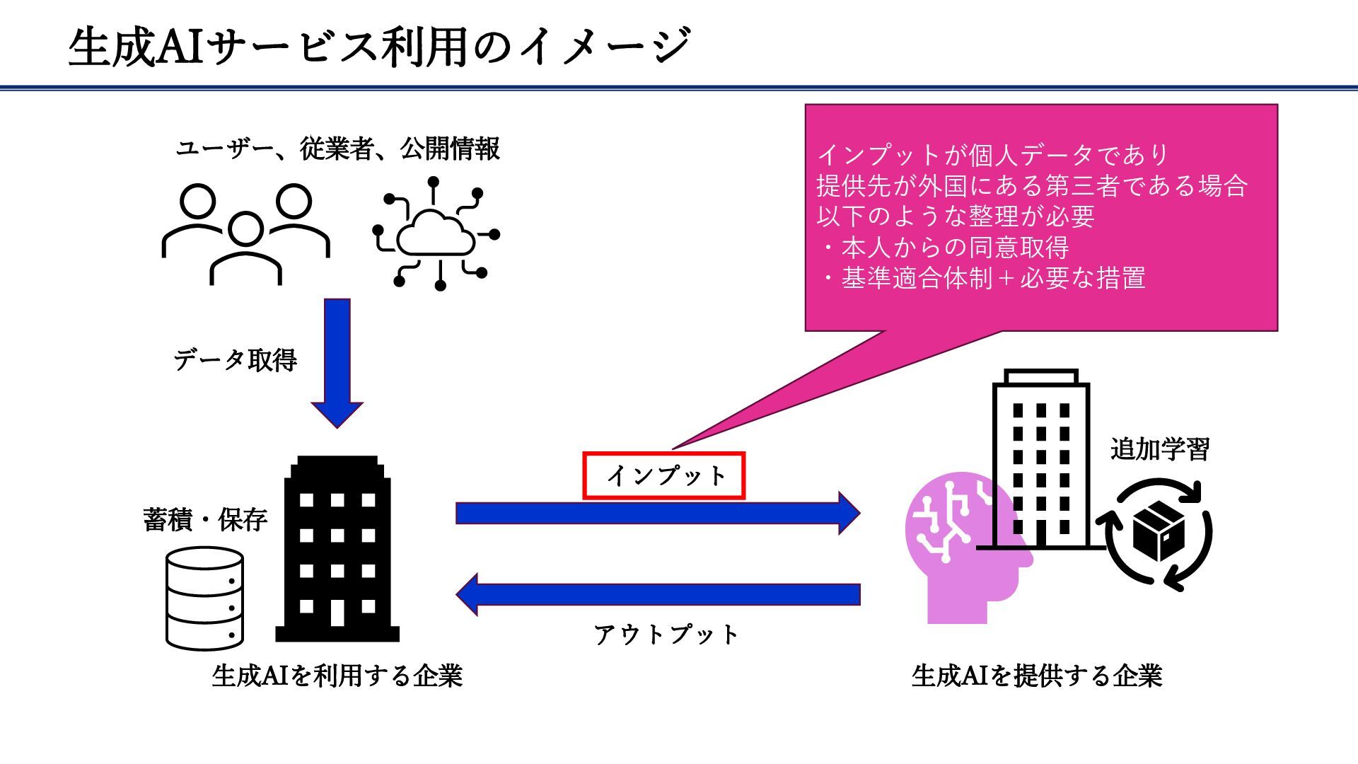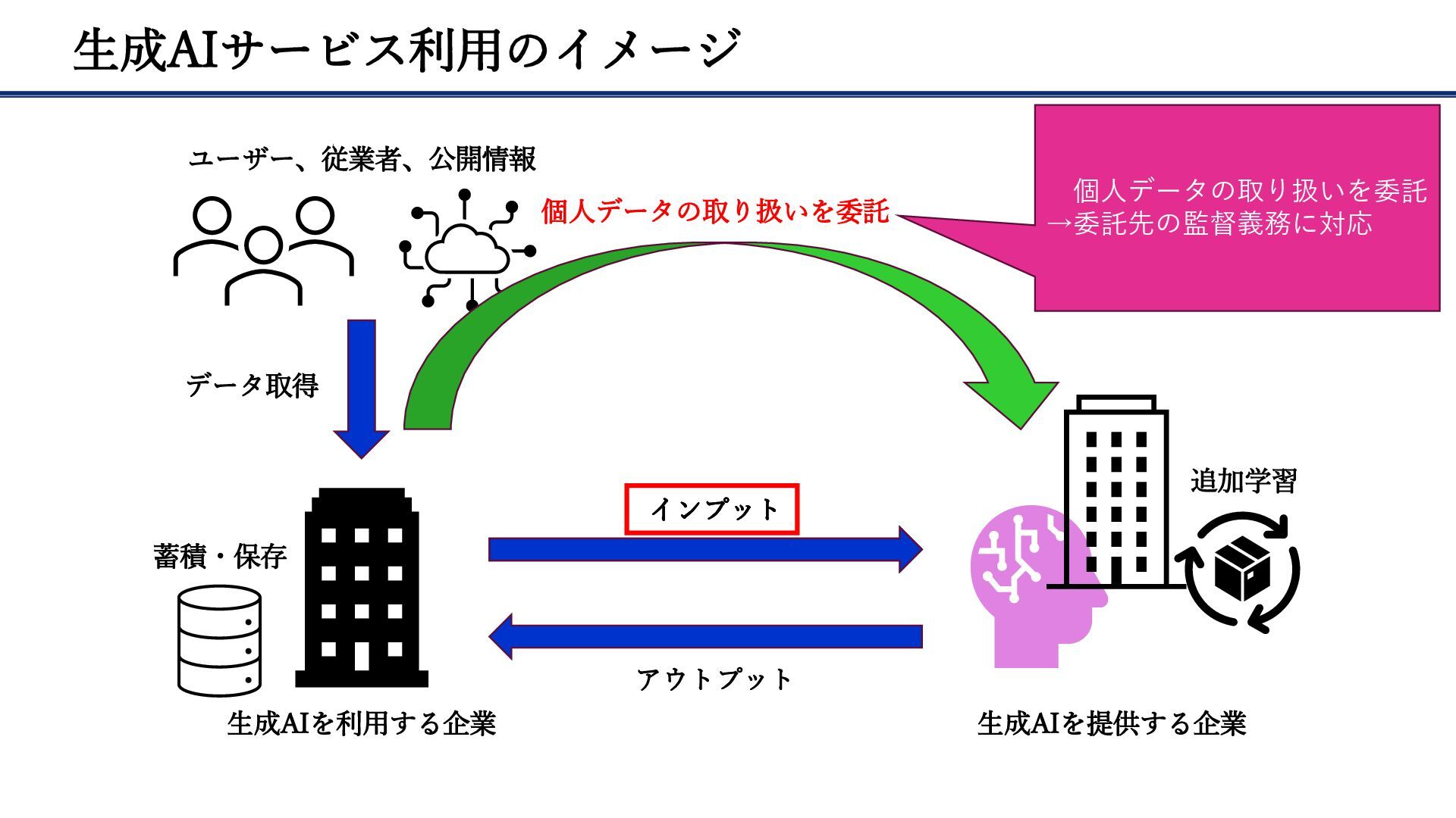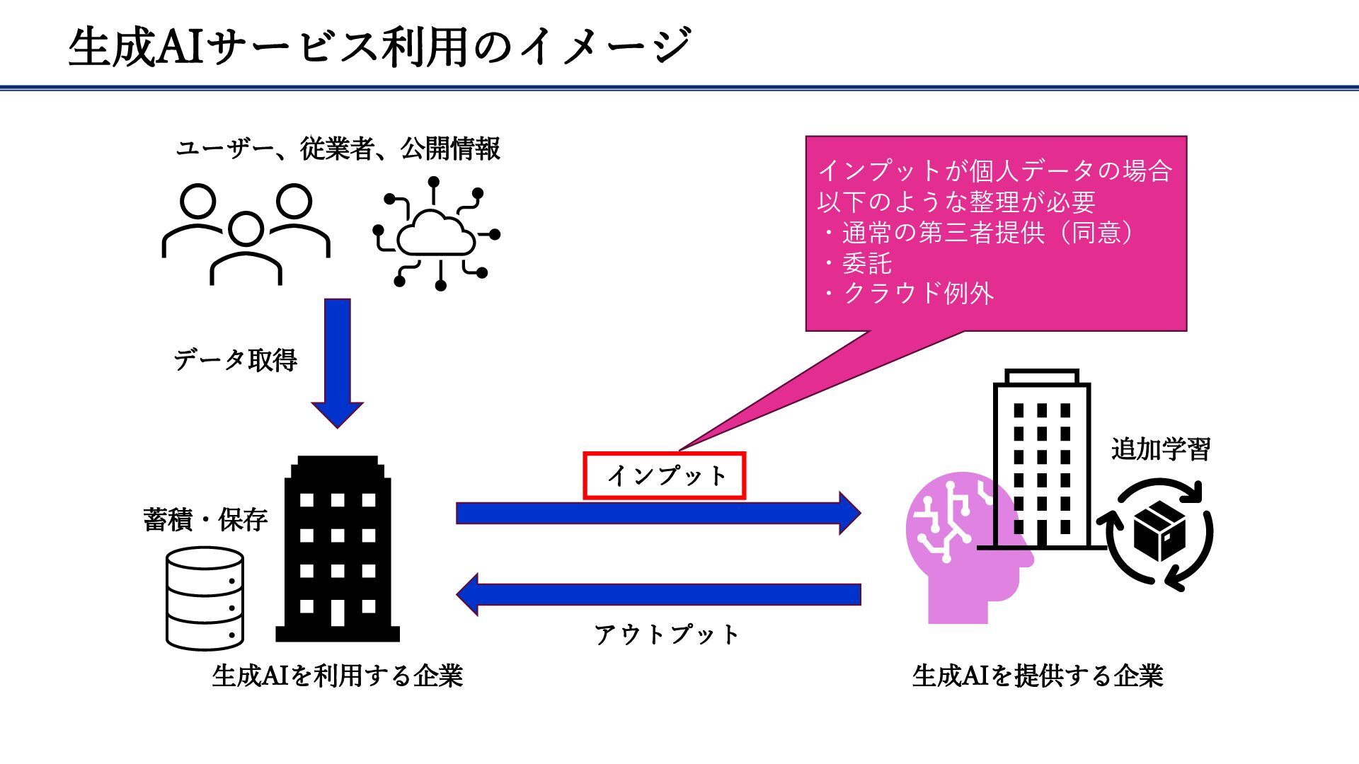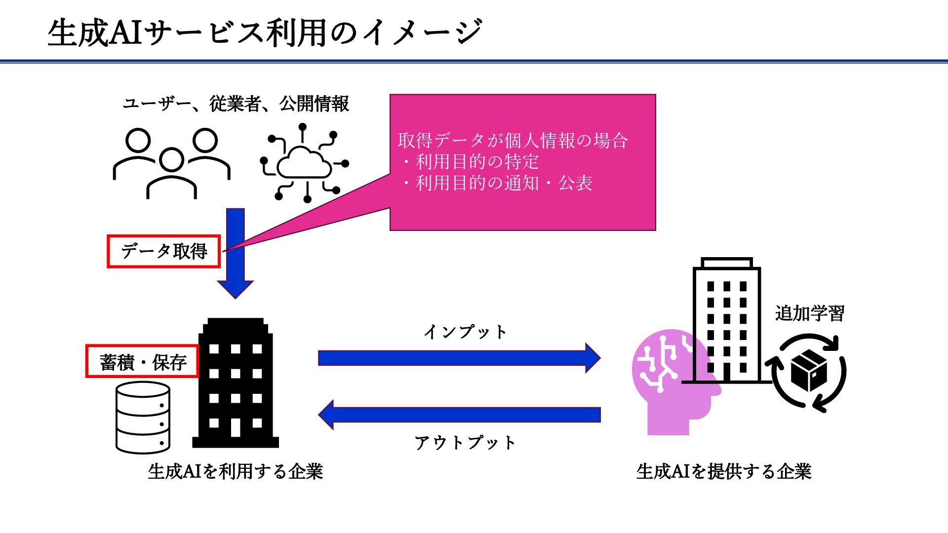 生成AIサービス利用のイメージ ユーザー、従業者、公開情報 データ取得 生成AIを利用する企業 生成AIを提供する企業 インプット アウトプット 蓄積・保存 追加学習 インプットが個人データの場合