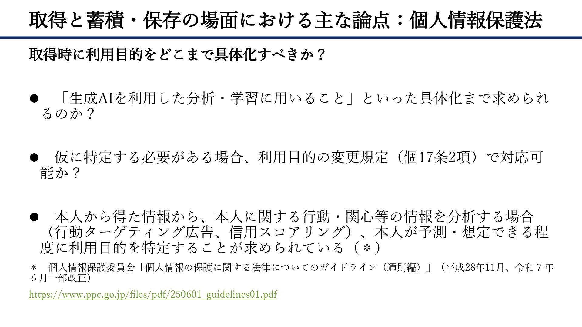 取得と蓄積・保存の場面における主な論点:個人情報保護法 取得時に利用目的をどこまで具体化すべきか? ⚫ 「生成AIを利用した分析・学習に用いること」といった具体化まで求められ るのか? ⚫ 仮に特定する必要がある場合、利用目的の変更規定(個17条2項)で対応可 能か? ⚫ 本人から得た情報から、本人に関する行動・関心等の情報を分析する場合