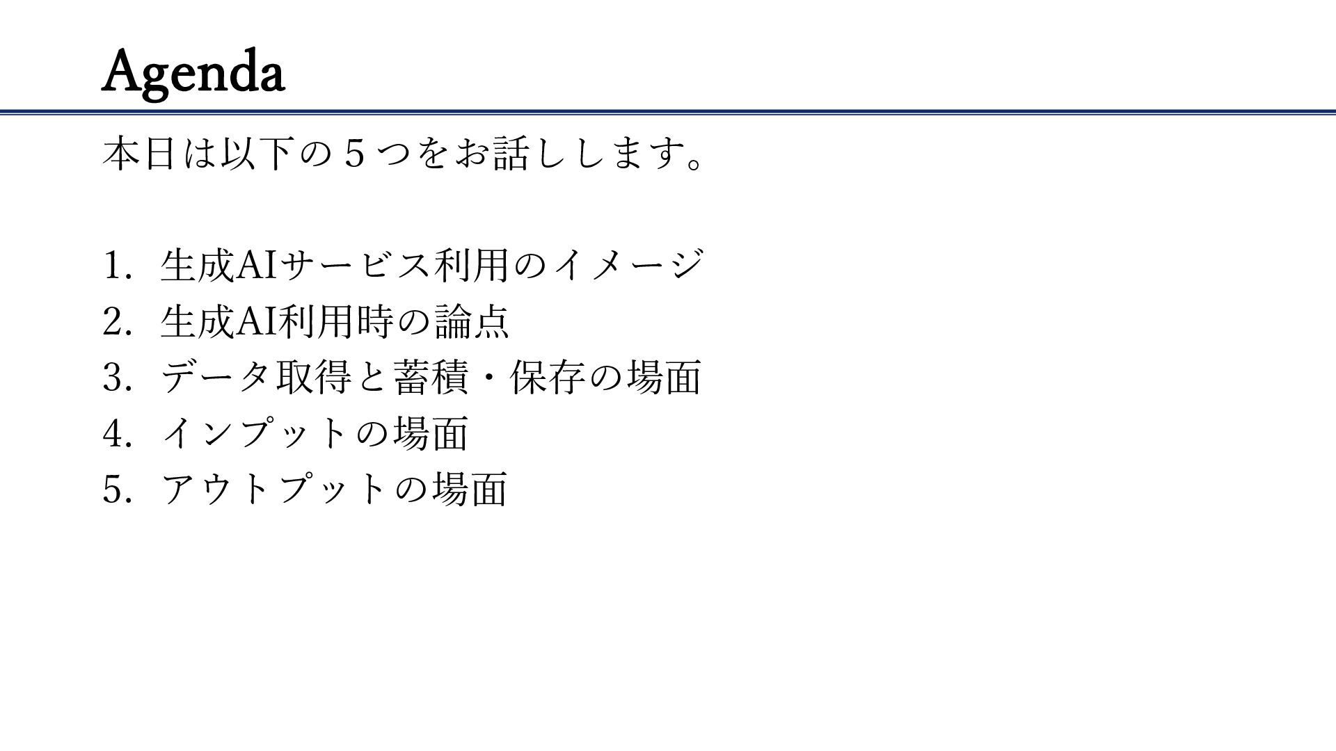 Agenda 本日は以下の5つをお話しします。 1. 生成AIサービス利用のイメージ 2. 生成AI利用時の論点 3. データ取得と蓄積・保存の場面 4. インプットの場面