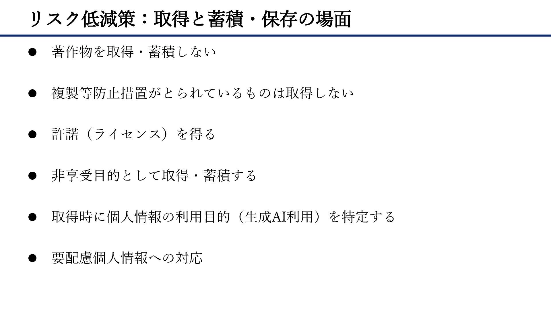 リスク低減策:取得と蓄積・保存の場面 ⚫ 著作物を取得・蓄積しない ⚫ 複製等防止措置がとられているものは取得しない ⚫ 許諾(ライセンス)を得る ⚫ 非享受目的として取得・蓄積する ⚫