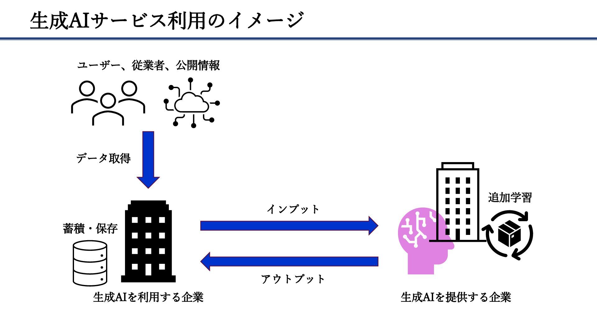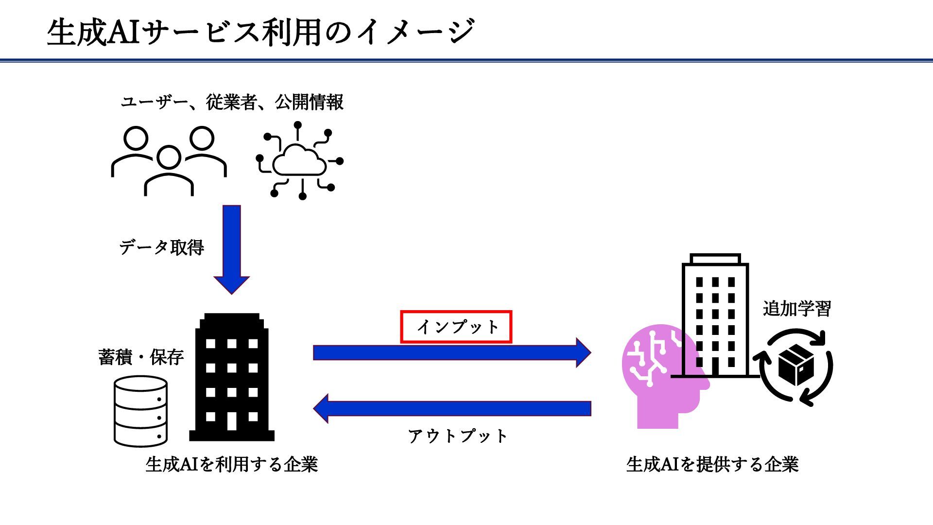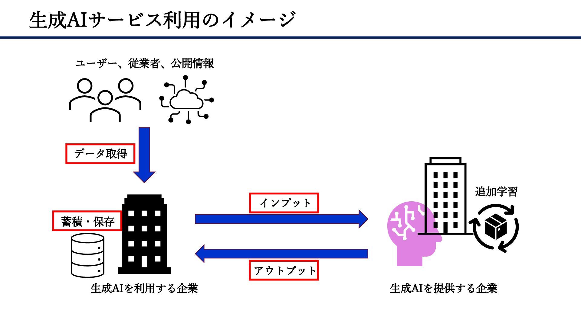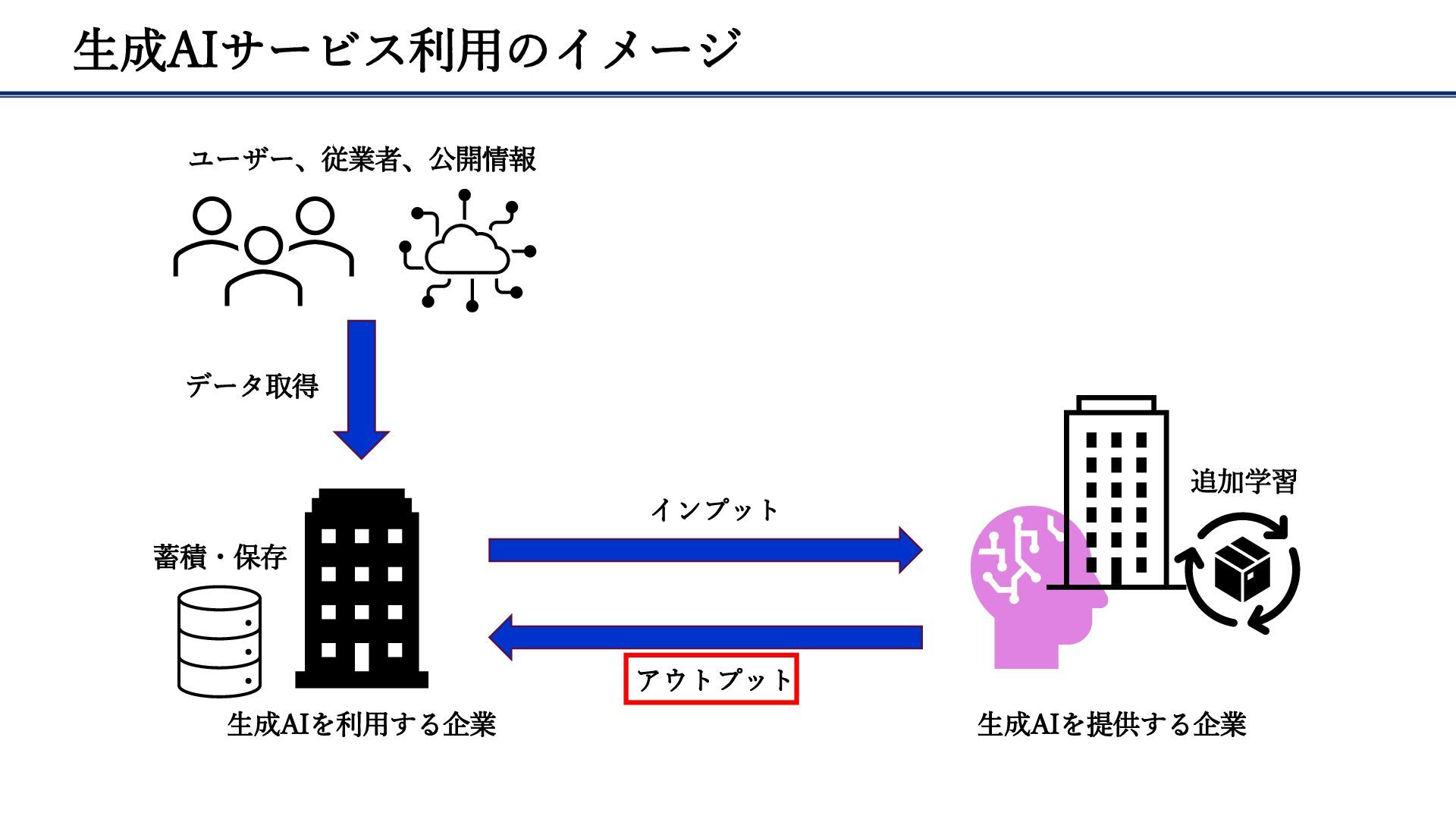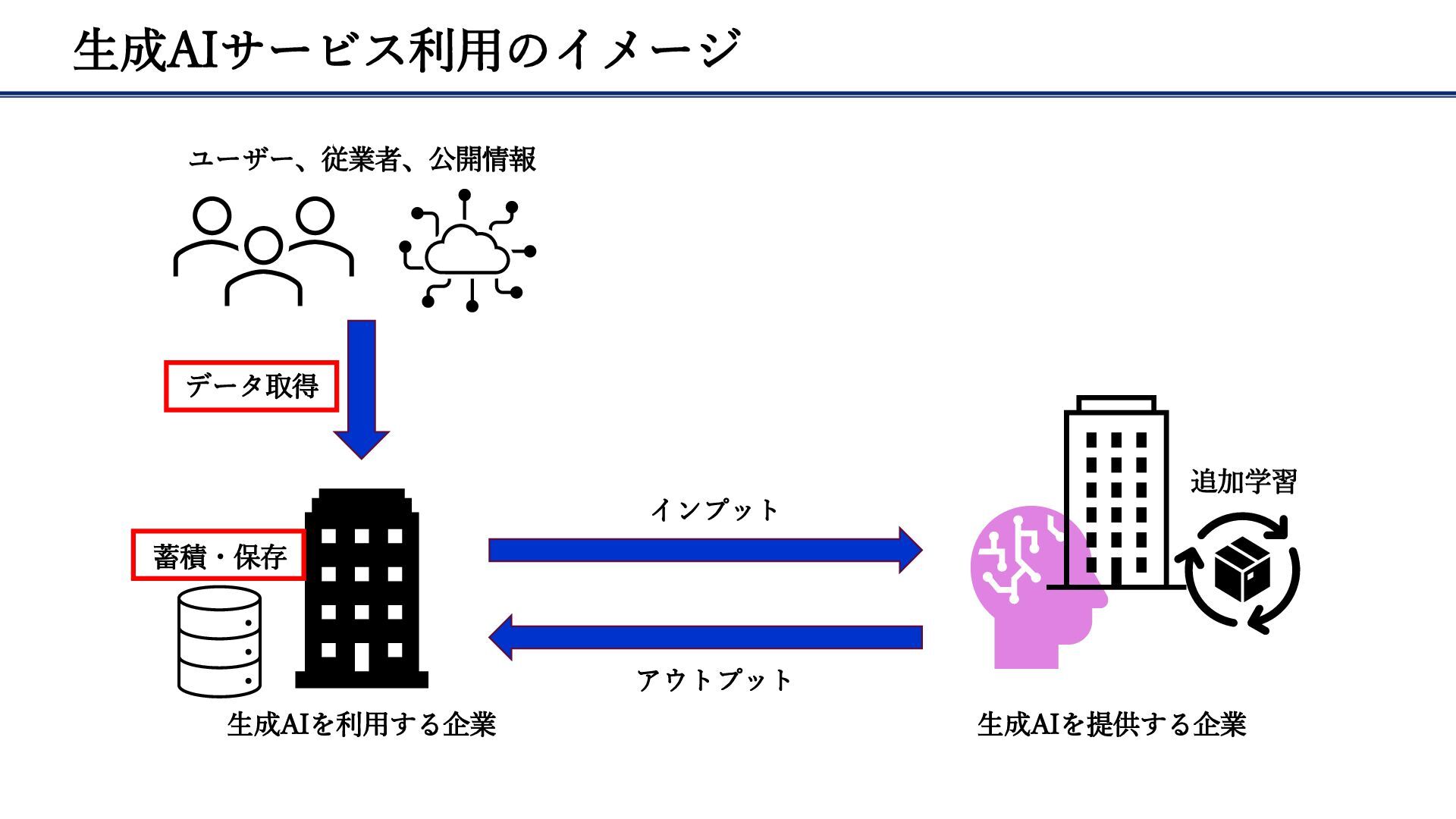 生成AIサービス利用のイメージ ユーザー、従業者、公開情報 データ取得 生成AIを利用する企業 生成AIを提供する企業 インプット アウトプット 蓄積・保存 追加学習 インプット